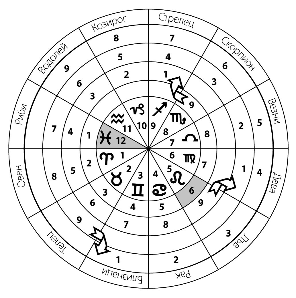 ПРАВИЛО: В своя житейски път човек преминава през 4 основни цикли, всеки от които започва в нумерична вибрация 1 и завършва в нумерична вибрация 9, но основната му тоналност винаги произтича от характеристиката на зодиакалното поле, в което е започнал първият му жизнен цикъл. Четирите основни жизнени цикли, които на схемата са представени със стрелки, се повтарят аналогично до края на живота. И така, първият цикъл съответства на петия, вторият – на шестия, третият на седмия, четвъртият на осмия жизнен цикъл и отново деветият съответства на първия и на петия и т.н.