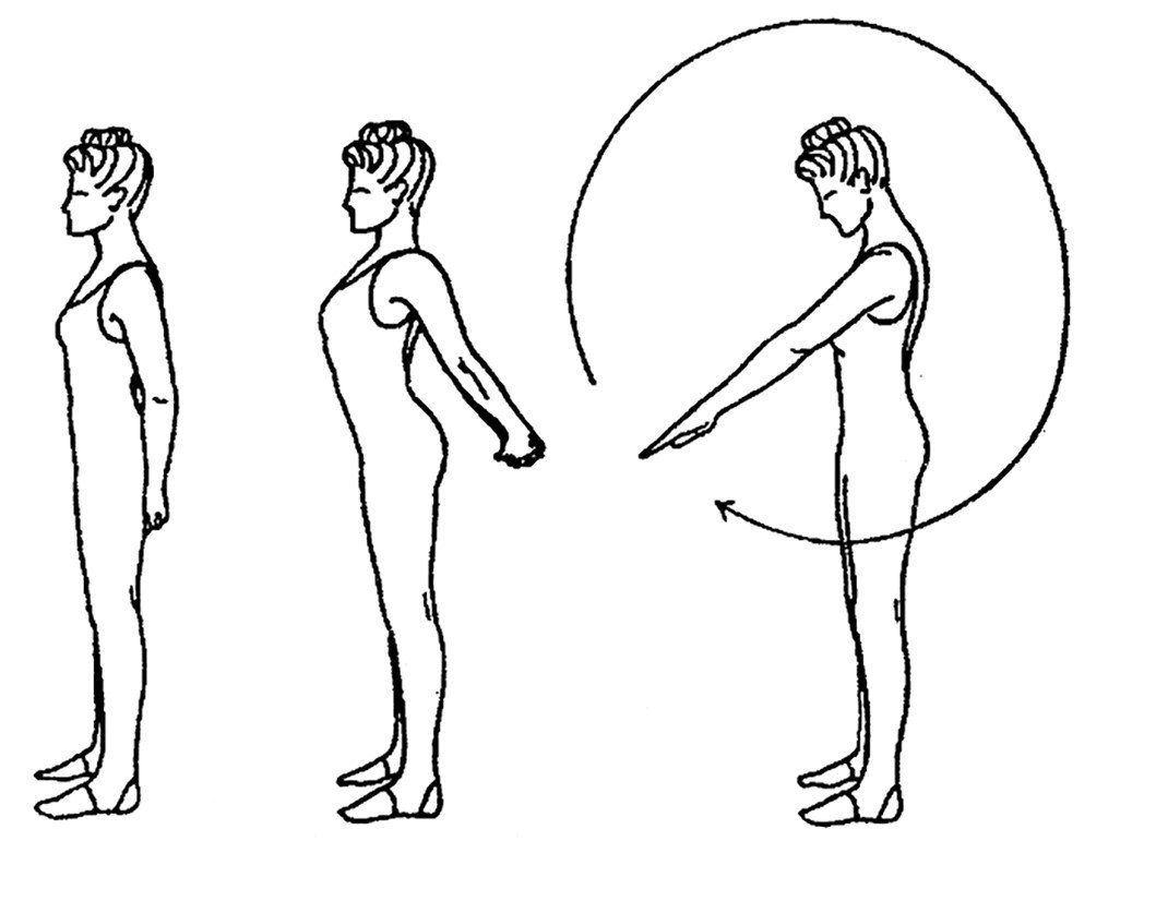 - Издишвайки, пуснете ръцете си и ги вдигнете пред тялото. Продължете да вдигате ръце покрай главата, после покрай гърба и завършете цикъла на кръговото движение отново отпред. Пръстите ви трябва да останат опънати по време на завъртането.
