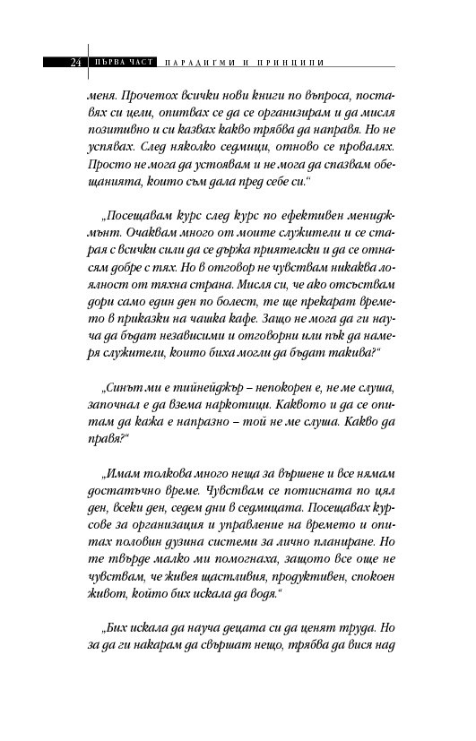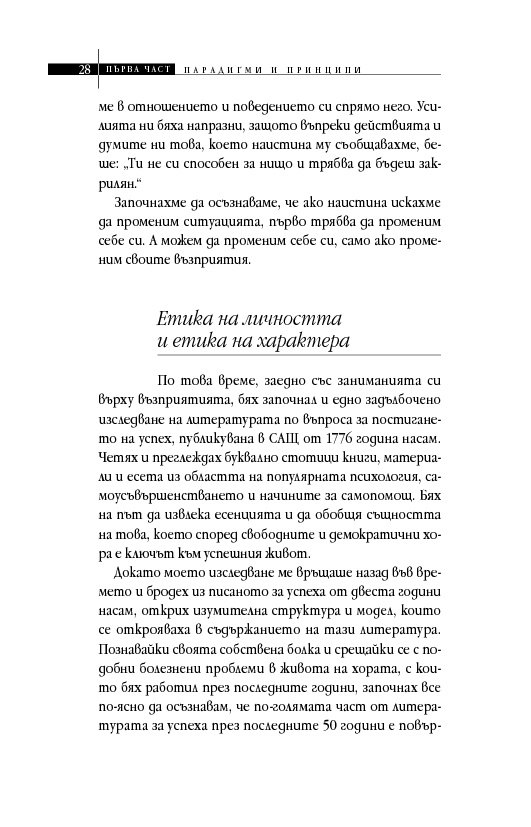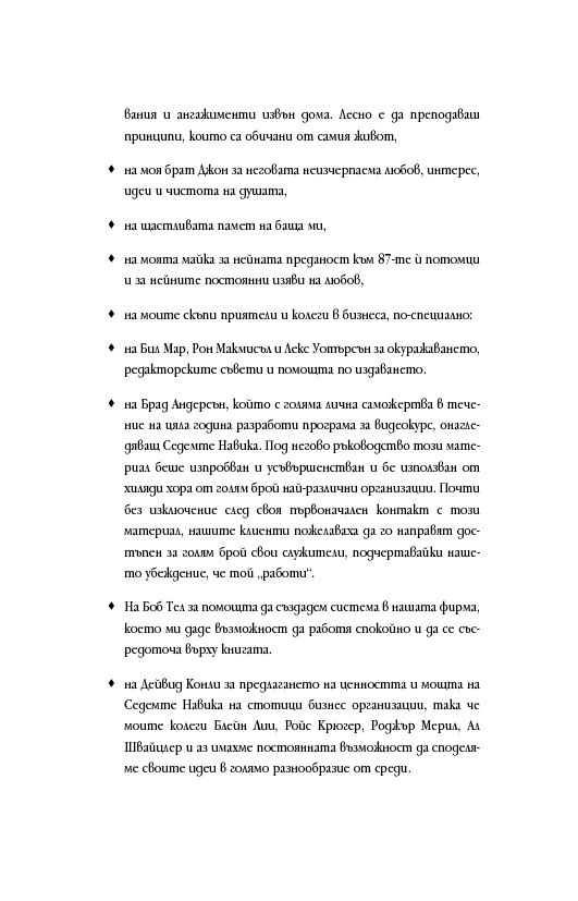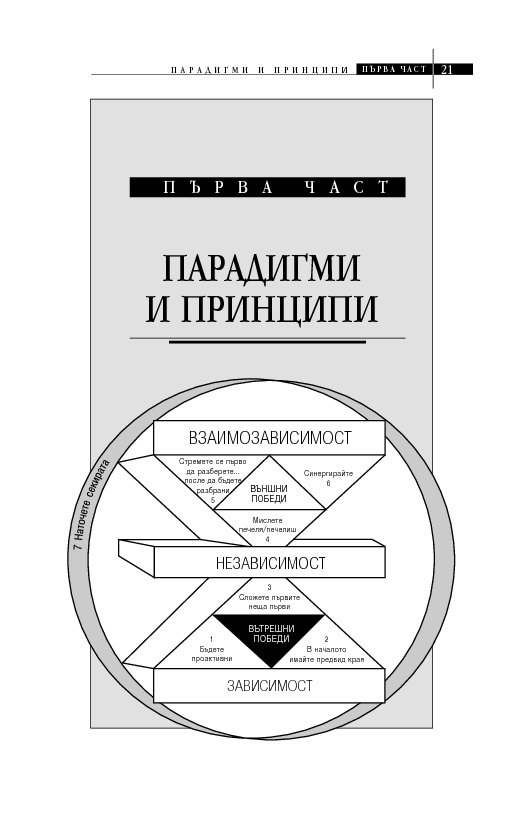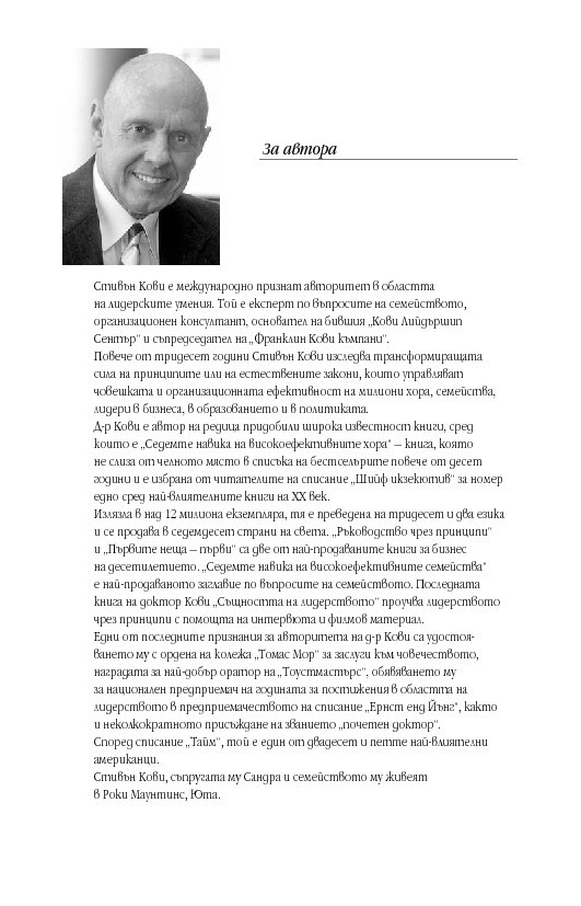 Простичко, ясно и подредени в стройна работеща система са представени седем универсални жизнени постулата, които ще помогнат на мотивирания човек да постигне успех в една или друга област. Седемте принципа на Кови са изведени след проучването на огромен по обема си материал в областта на управлението, лидерството и психологията, в т.ч. организационната, както и на истории от живота на известни личности.