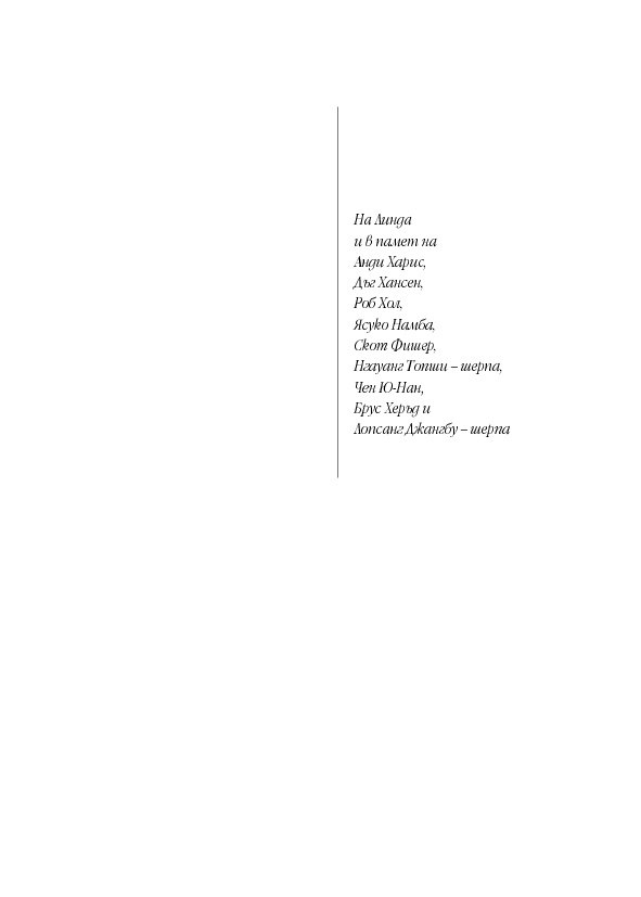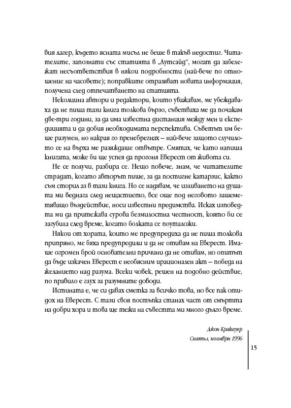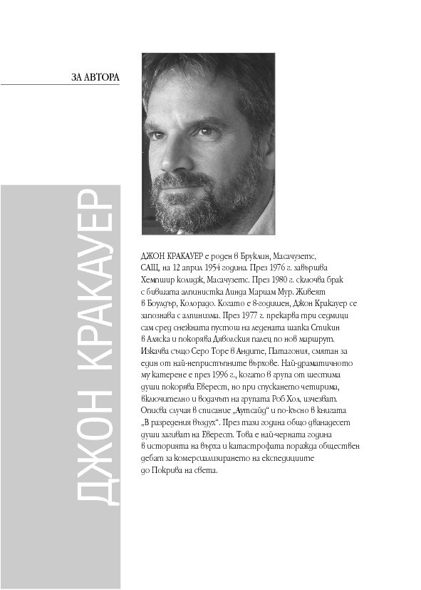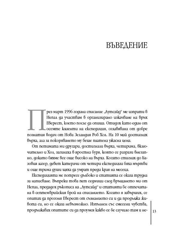 „Прекрасна, завладяваща... Кракауер е едновременно алпинист от световна класа и, без съмнение, най-добрият разказвач сред англоезичните автори, пишещи за този спорт.“