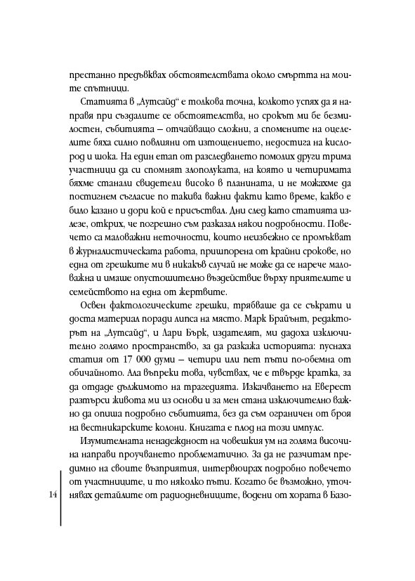Защото не се опитва да ни убеди в нищо. Сурова документалистика, с много студ, малко кислород и твърде много смърт. Оставя читателя с тягостно чувство и много въпроси. Опит на съвестен журналист и почтен човек да разкаже обективно „какво се обърква тогава“, без грам художествено притворство и лукави… (Прочетете целия текст.)