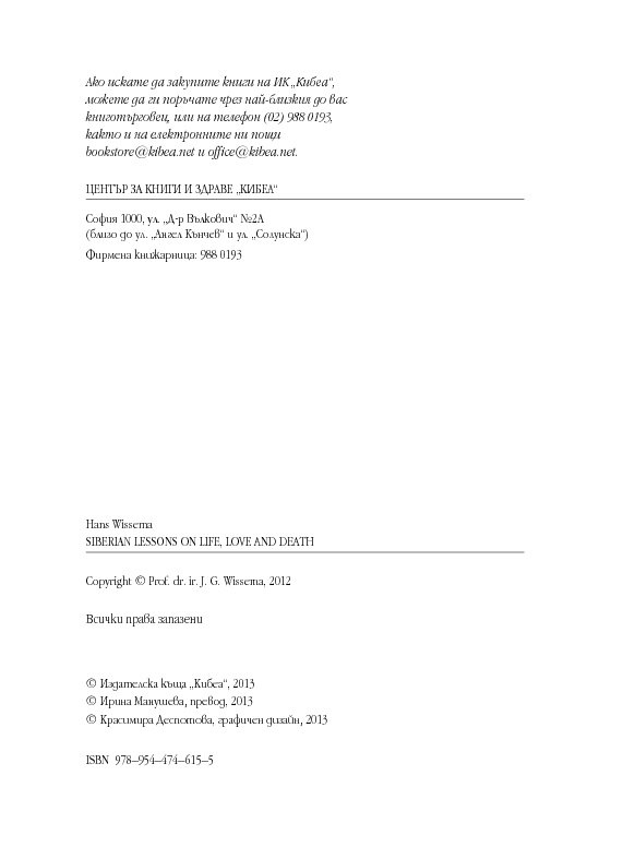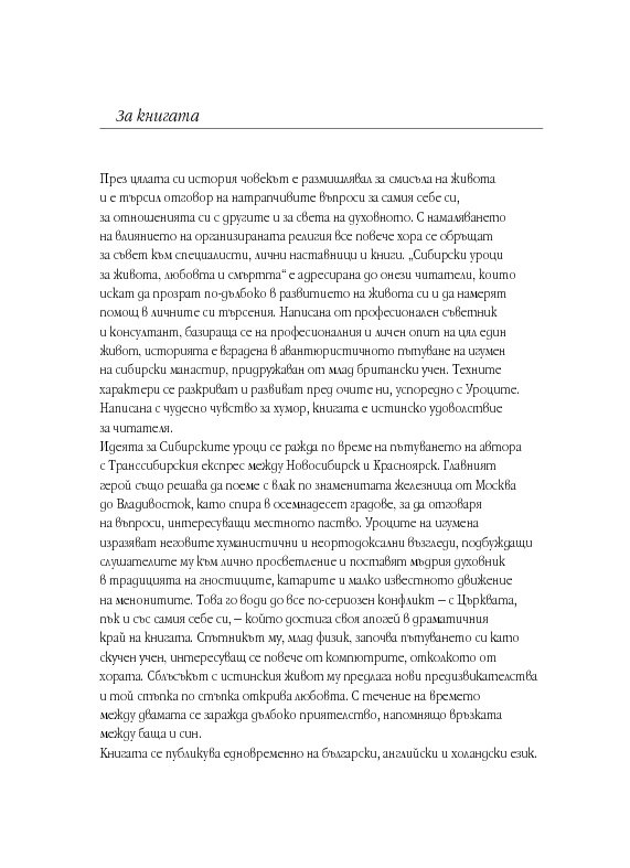През цялата си история човекът е размишлявал за смисъла на живота и е търсил отговор на натрапчивите въпроси за самия себе си, за отношенията си с другите и за света на духовното. С намаляването на влиянието на организираната религия все повече хора се обръщат за съвет към специалисти, лични наставници и книги. „Сибирски уроци за живота, любовта и смъртта“ е адресирана до онези читатели, които искат да прозрат по-дълбоко в развитието на живота си и да намерят помощ в личните си търсения.