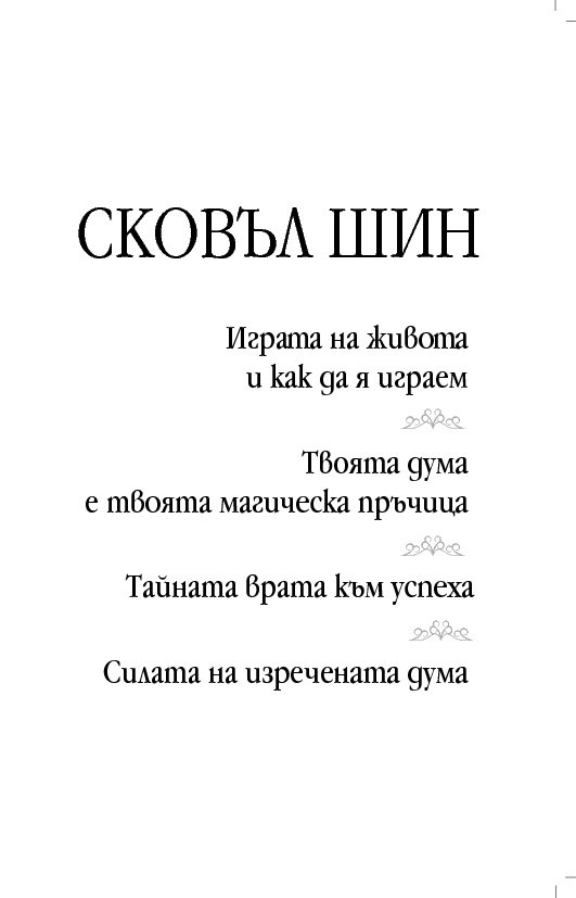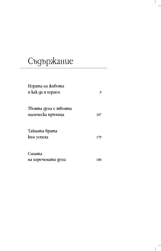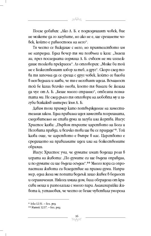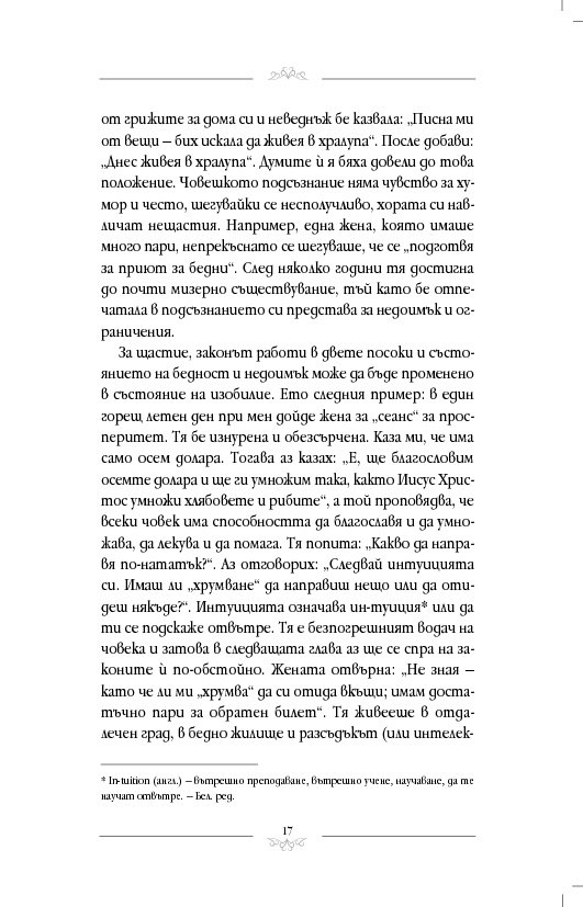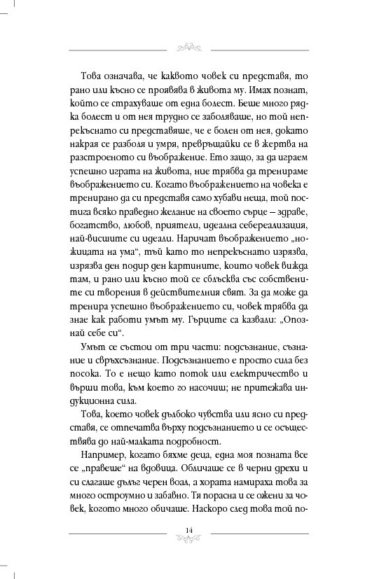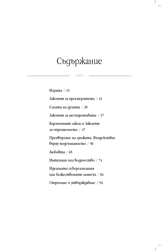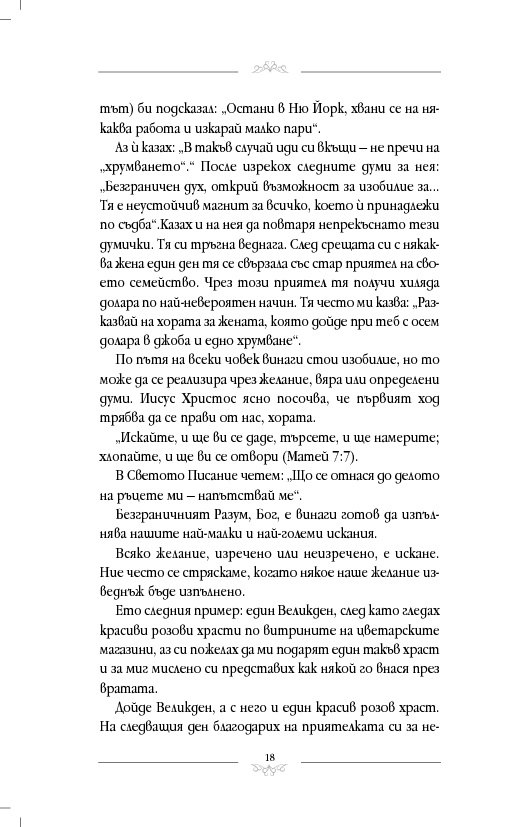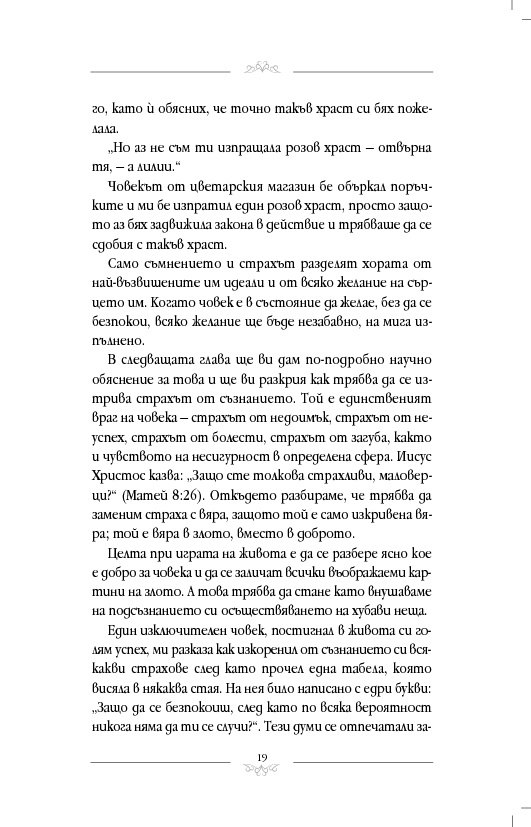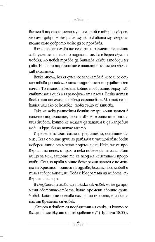 Твоят свят е свят на кристализирали мисли и думи. Рано или късно ще береш плодовете им. Няма да влезеш в царството на изобилието, ако оплакваш съдбата си. Божият дар за човека е власт: сила и власт над цялото творение, над ума, тялото и делата. За да си служиш с божията сила, трябва да й дадеш предимство. В момента, в който поискаш нещо, безграничният разум знае как да изпълни молбата ти. Ролята на човека е да се радва и да благодари, да действа според вярата си.