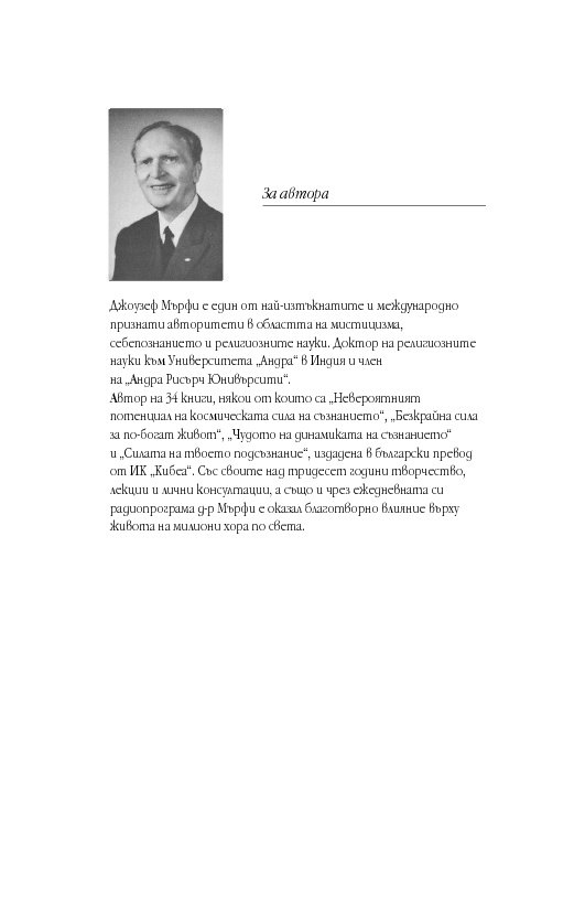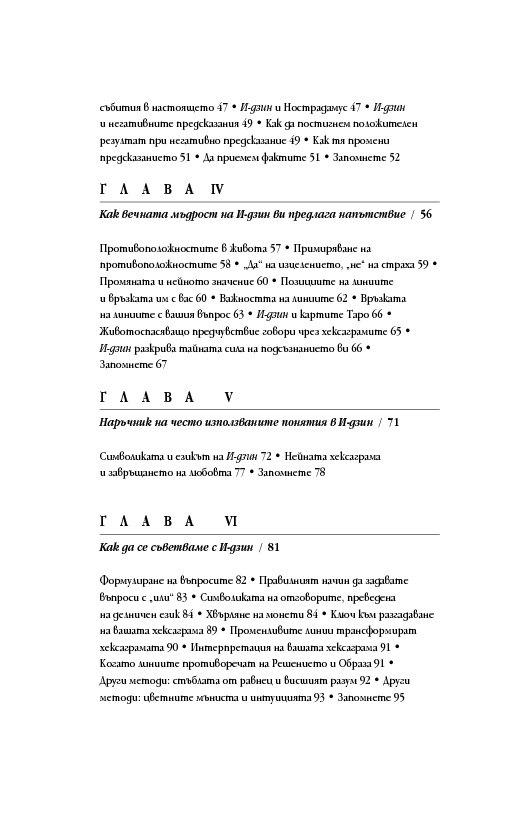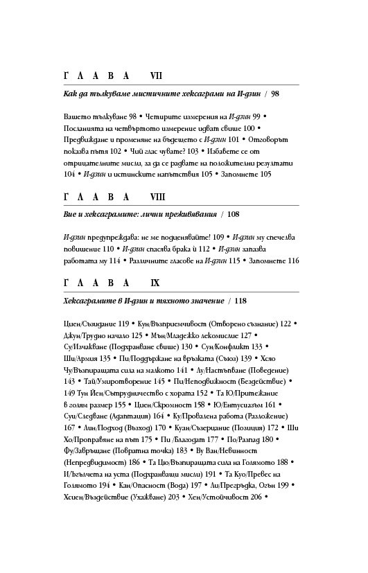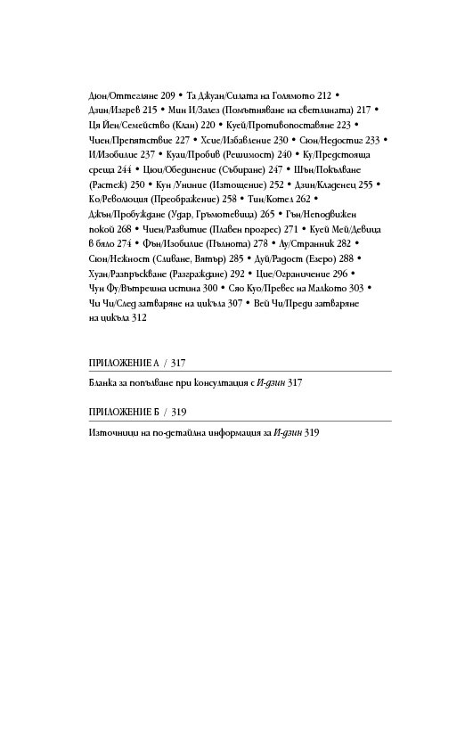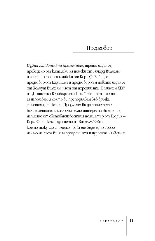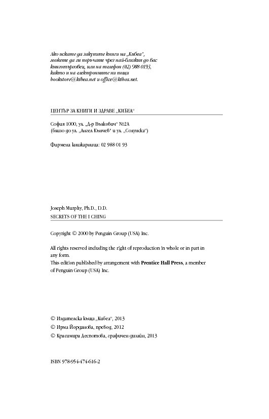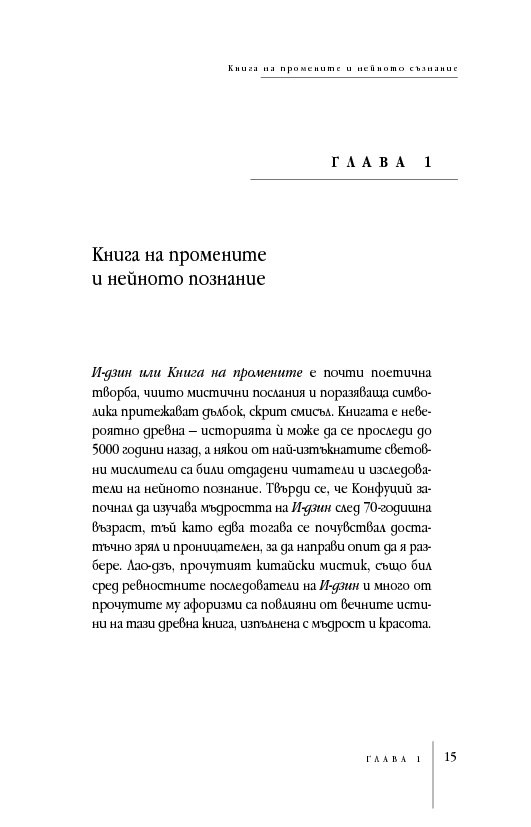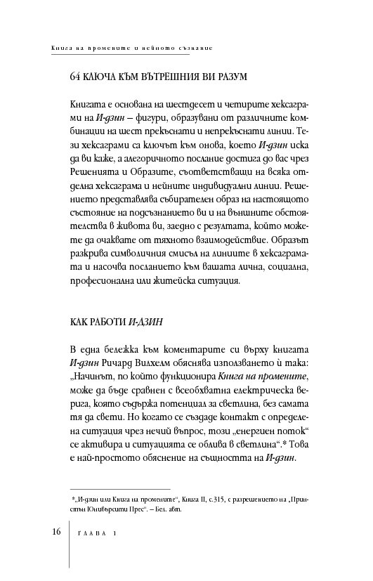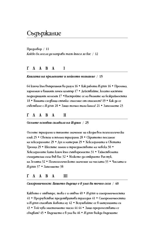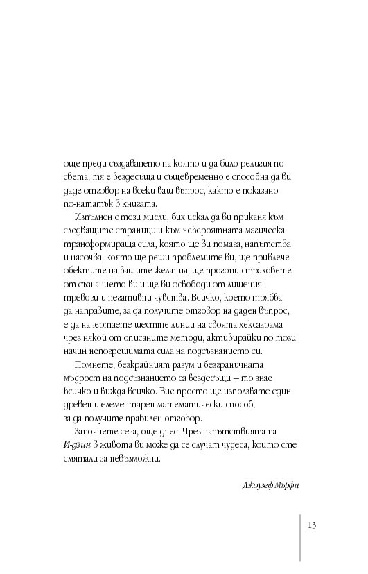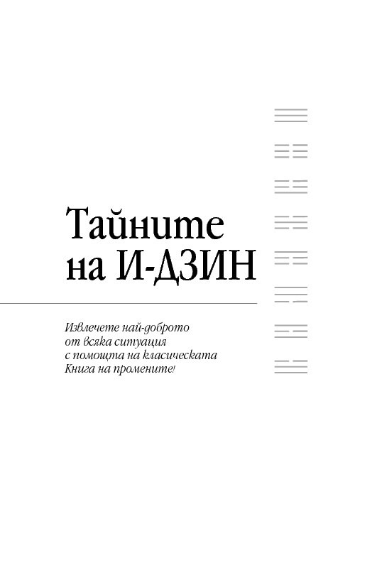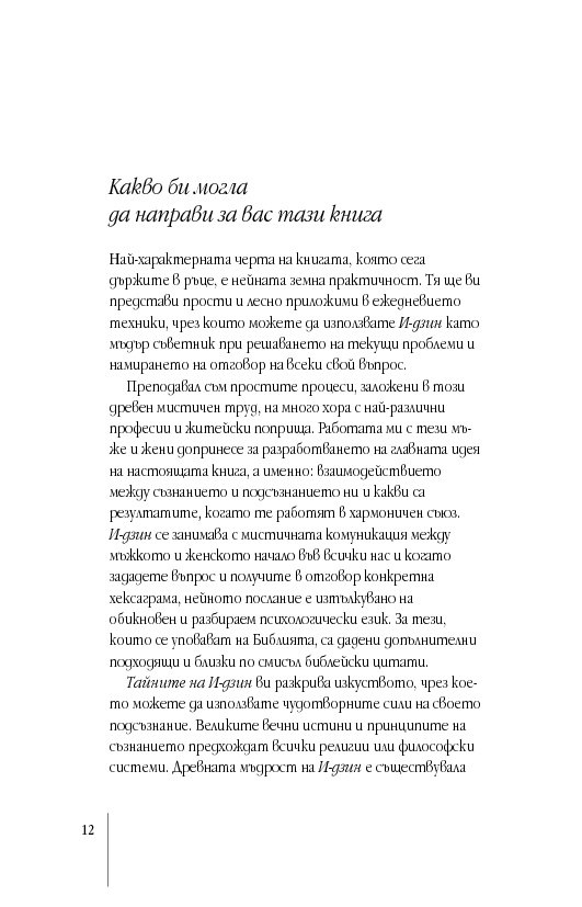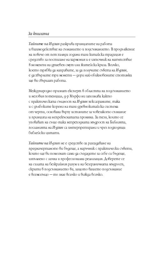 Международно признат експерт в областта на подсъзнанието и неговия потенциал, д-р Мърфи ни запознава както с практическата същност на И-дзин хексаграмите, така и с дълбоките корени на тази древнокитайска система от черти, основана върху истините за човешкото съзнание и принципа на непрекъснатата промяна. За тези, които се уповават на също така непреходната мъдрост на Библията, посланията на И-дзин са интерпретирани и чрез подходящи библейски цитати.