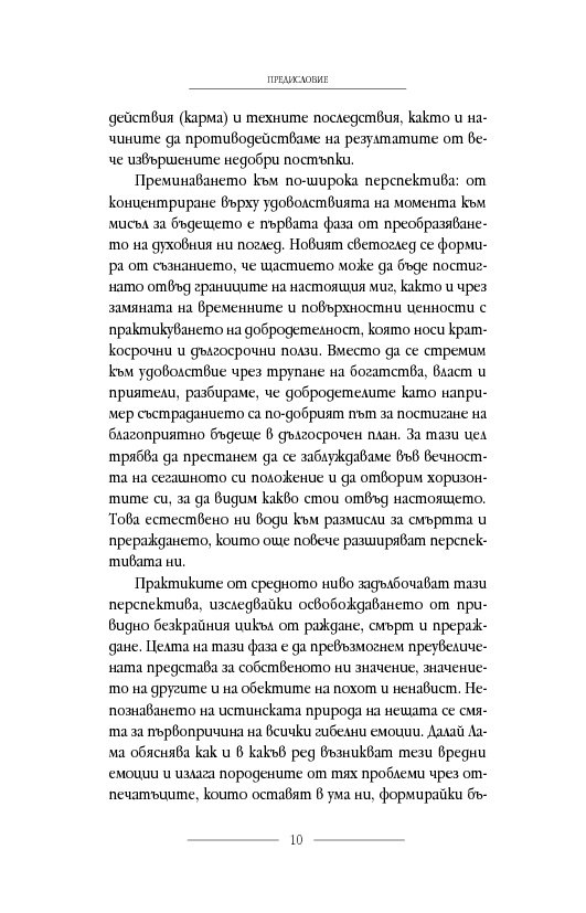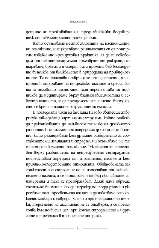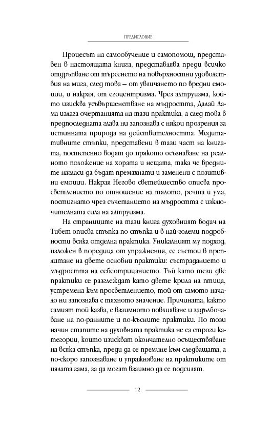 Позовавайки се на традиционните будистки медитативни практики и на примери от днешния изпълнен с проблеми свят, той ни предлага упражнения, които да подпомогнат духовното ни развитие. Следвайки духовните практики, очертани в книгата, можем да се научим как да заменим негативните чувства с положителни нагласи и да поемем по пътя, водещ към по-извисено състояние – и вътре в себе си, и в големия свят.