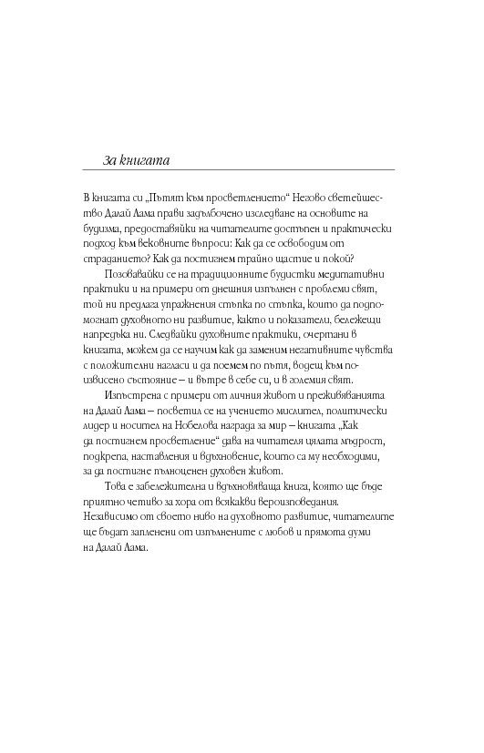 В книгата си „Пътят към просветлението“ Негово светейшество Далай Лама прави задълбочено изследване на основите на будизма, предоставяйки на читателите достъпен и практически подход към вековните въпроси: Как да се освободим от страданието? Как да постигнем трайно щастие и покой?