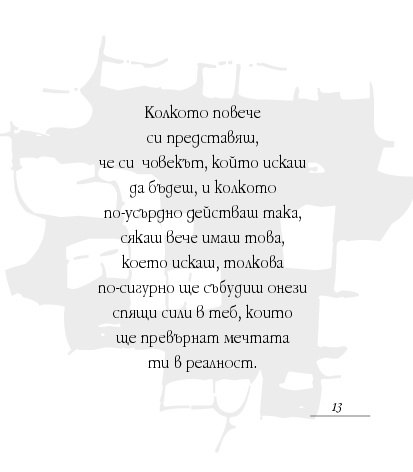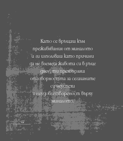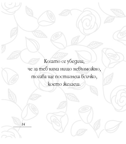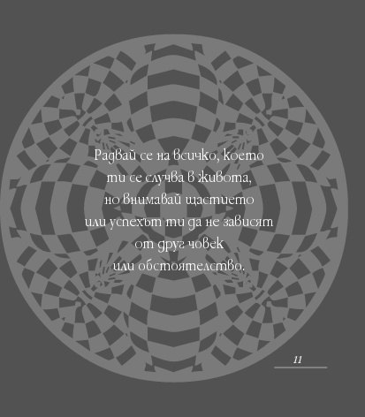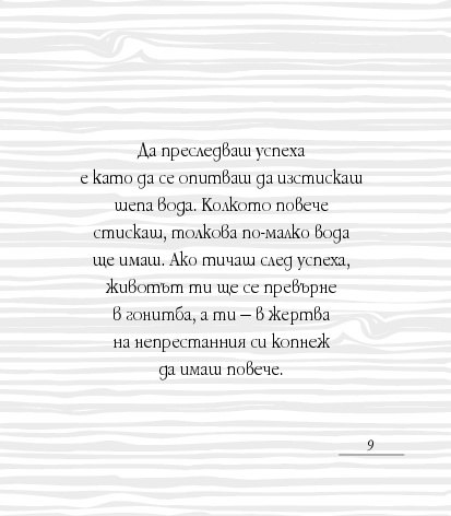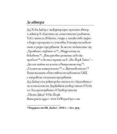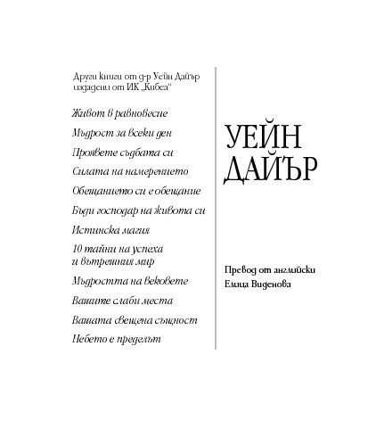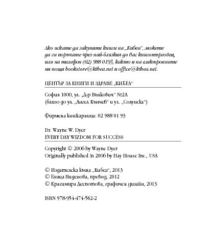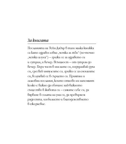 Посланията на Уейн Дайър в тази малка книжка Мъдрост за успех всеки ден са като здравословна „четка за зъби“ (по-точно „четка за ума“) – грижи се за здравето си и сутрин, и вечер. Всъщност – от сутрин до вечер. Бъди чист в мислите си, подхранвай духа си, сресвай импулсите си, грижи се за емоциите си, вслушвай се в сърцето си. Приятни и гальовни послания, които отново ни напомнят колко е важно да обичаме най-важното същество в живота си – самите себе си, да вярваме в силата на ума си, да превърнем радостта, изобилието и благоденствието в ежедневие.
