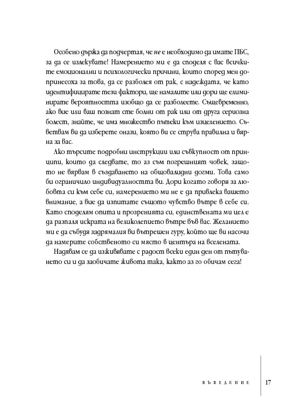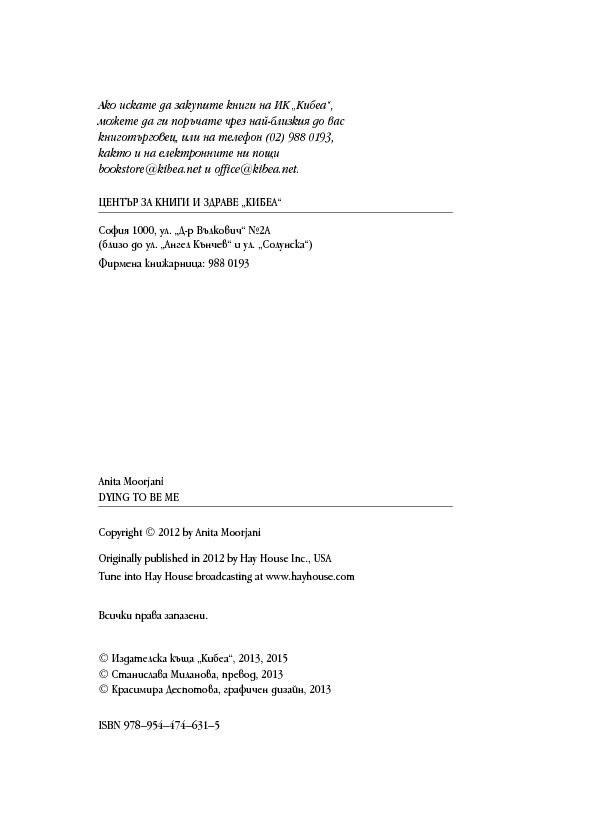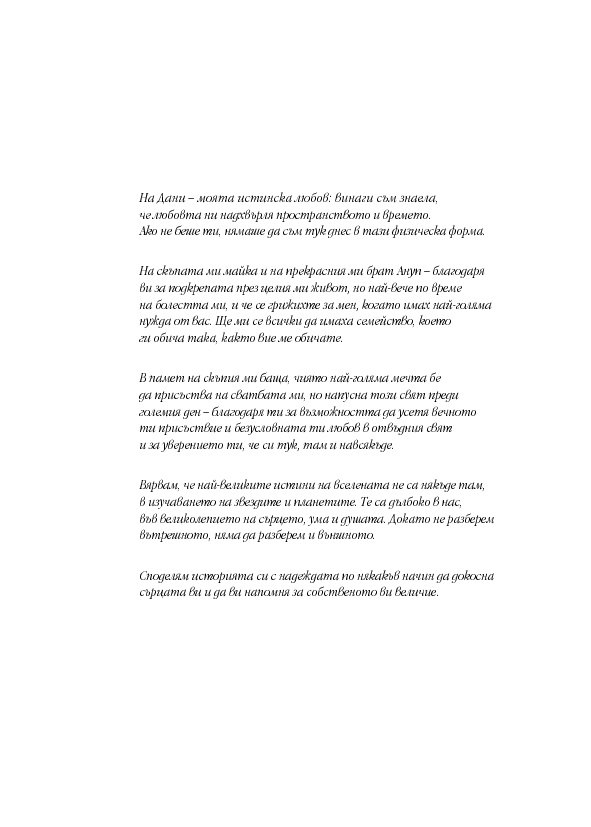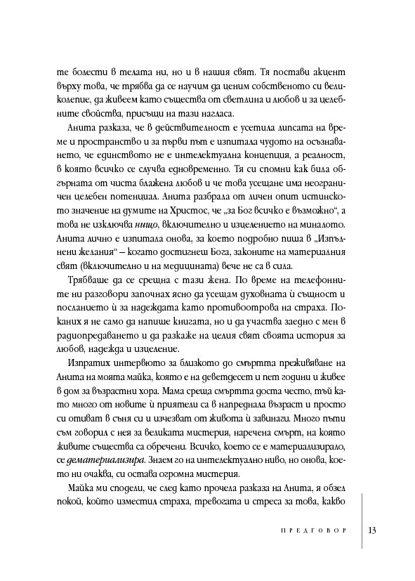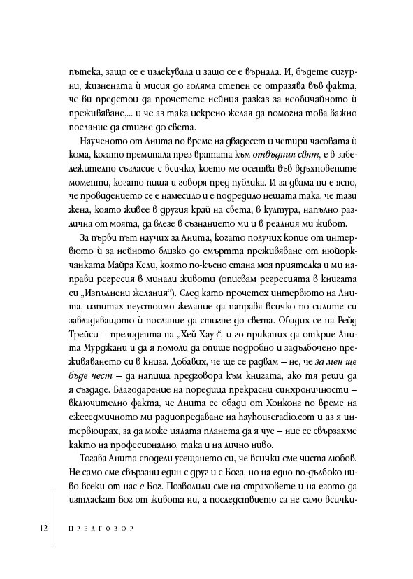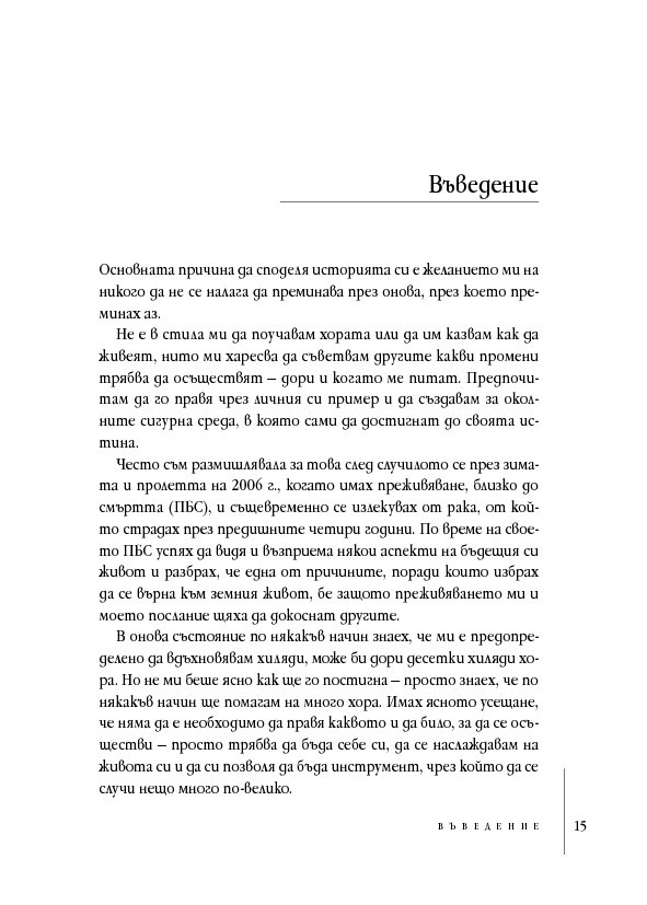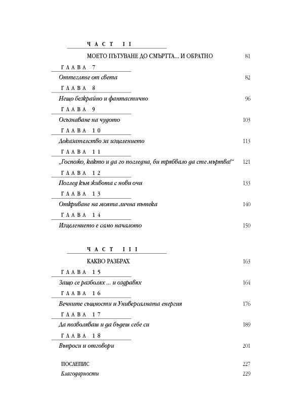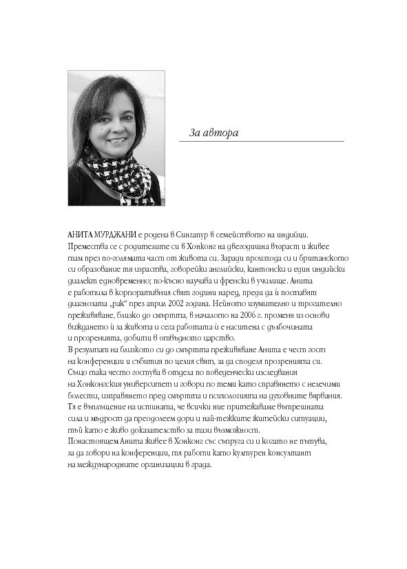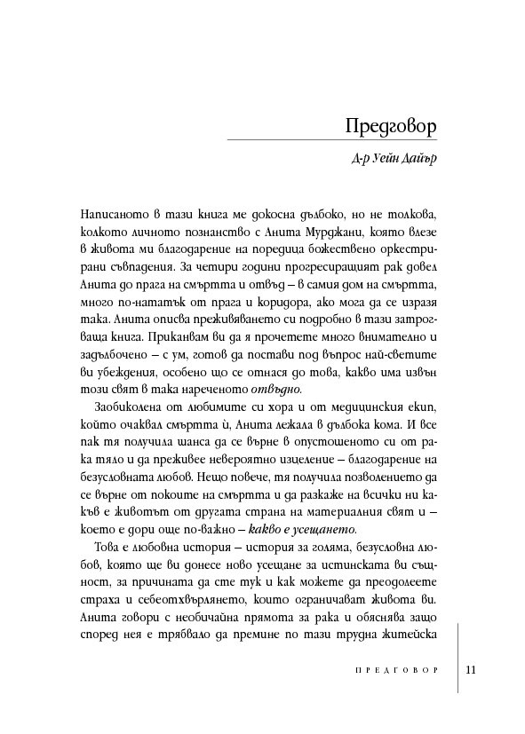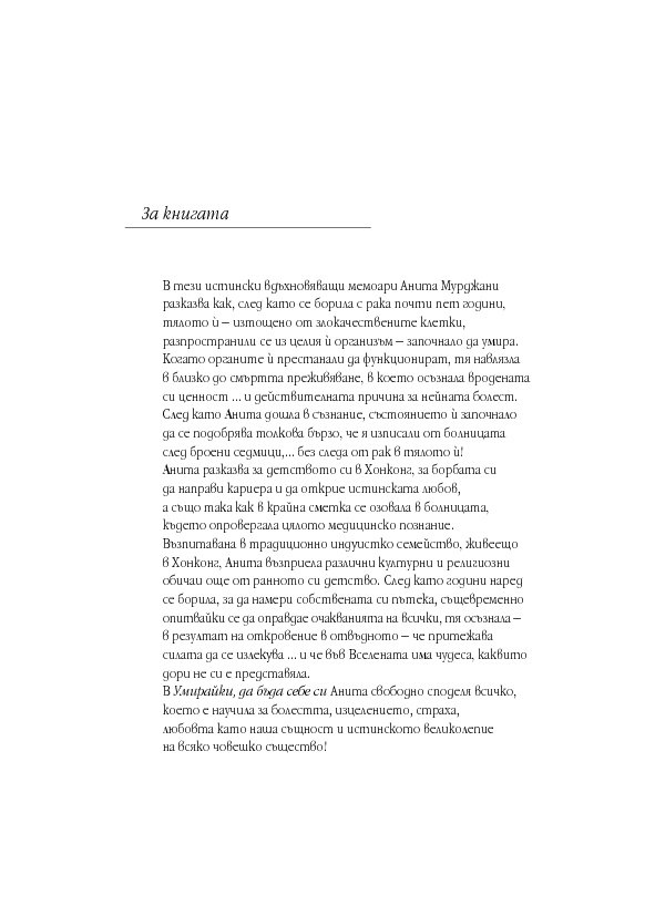 В тези истински вдъхновяващи мемоари Анита Мурджани разказва как, след като се е борила с рака почти пет години, тялото ѝ – изтощено от злокачествените клетки, разпространили се из целия ѝ организъм – започнало да умира. Когато органите ѝ престанали да функционират, тя навлязла в близко до смъртта преживяване, в което осъзнала вродената си ценност ... и действителната причина за нейната болест. След като Анита дошла в съзнание, състоянието ѝ започнало да се подобрява толкова бързо, че я изписали от болницата след броени седмици,... без следа от рак в тялото ѝ!