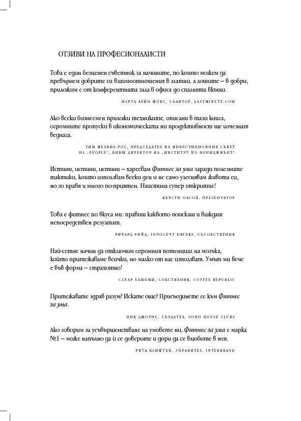 „Да стимулираме, подредим, успокоим и запазим в равновесие ума си – независимо дали ще използваме тази книга в личен или професионален аспект, тя е абсолютна необходимост. Можете да разчитате на нея, тя ще ви бъде полезна с прекрасни съвети!“