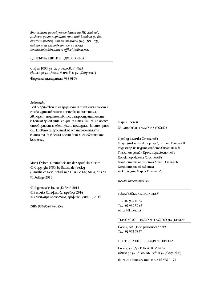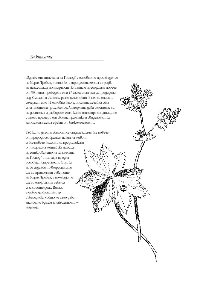 Тъй като днес, за жалост, се отдалечаваме все повече от природосъобразния начин на живот и все повече болести са предизвикани от погрешна житейска нагласа, преоткриването на „аптеката на Господ“ отговаря на една всеобща потребност. С това ново издание по-възрастните ще си припомнят съветите на Мария Требен, а по-младите ще ги открият за себе си и за своите деца. Винаги е добре да имаш мъдър събеседник, който не само дава знание, но вдъхва и най-ценното – надежда.