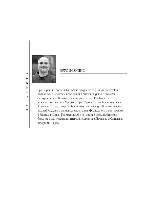 Книгите на Брус Францис са уникални в своята практичност и връзката си със съвременния живот. Водната традиция на даоизма се предава от хилядолетия от учител на ученик в непрекъсната верига. Даоисткото наследство, на което Францис принадлежи, е пряко свързано с това на Лао-дзъ, автора на „Дао-дъ дзин“ – една от най-превежданите книги в света.