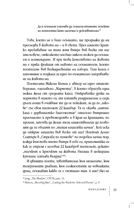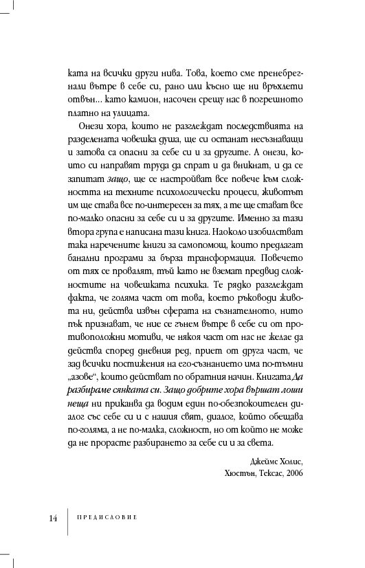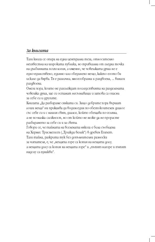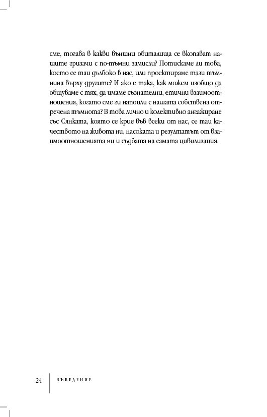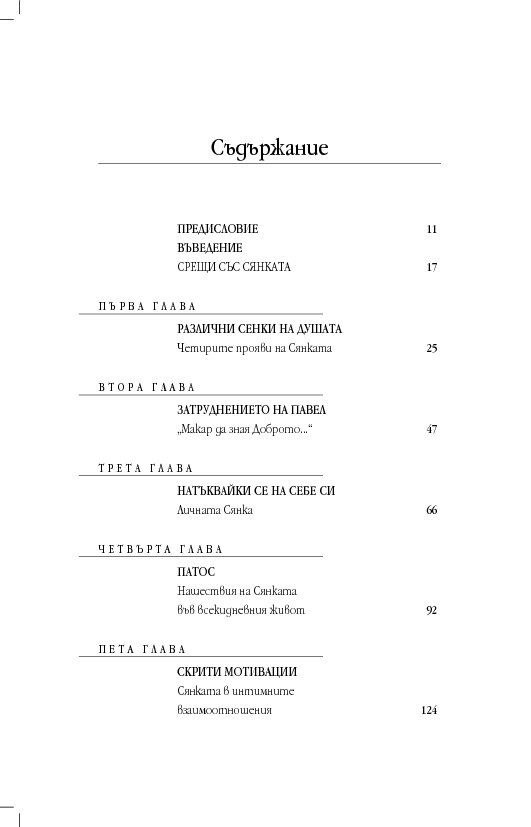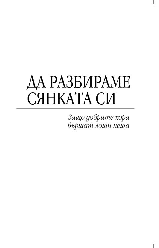 Съдържанието развива централната теза, относително неизвестна на широката публика, но тривиална от гледна точка на дълбинната психология, че човешката душа не е едно-единствено, единно или обединено нещо, както егото би искало да вярва. Тя е различна, многообразна и раздвоена, ... винаги раздвоена. Онези хора, които не разглеждат последствията на разделената човешка душа, ще си останат несъзнаващи и затова са опасни за себе си и другите. „Да разбираме сянката си. Защо добрите хора вършат лоши неща“ ни приканва да водим по-обезпокоителен диалог със себе си и с нашия свят, диалог, обещаващ по-голяма, а не по-малка сложност, но за да прорасте разбирането за себе си и за света.