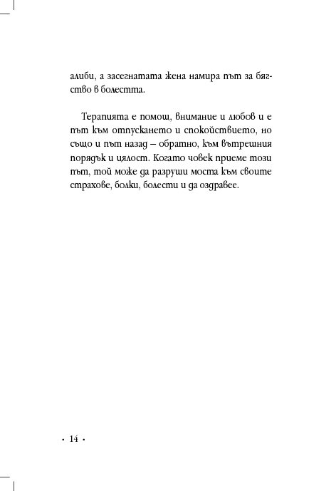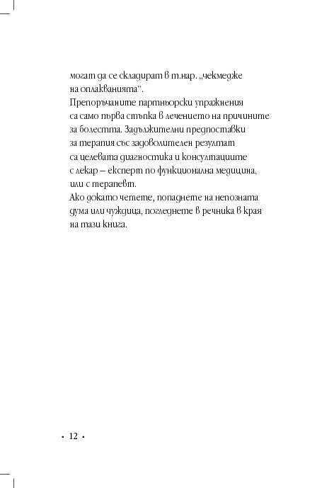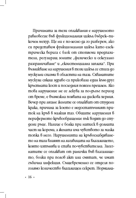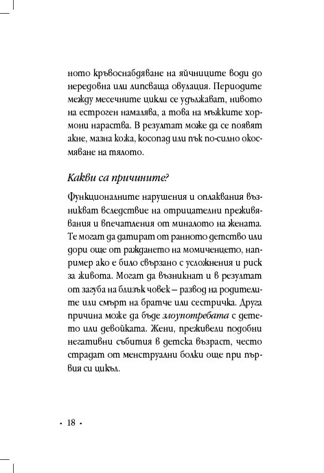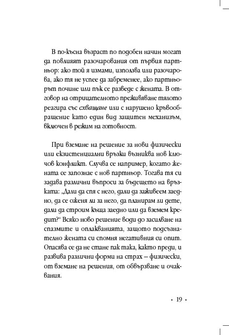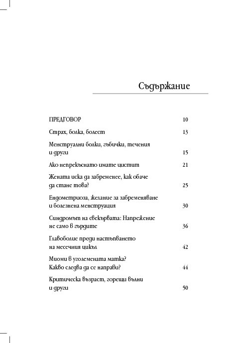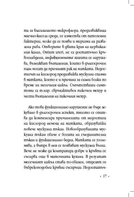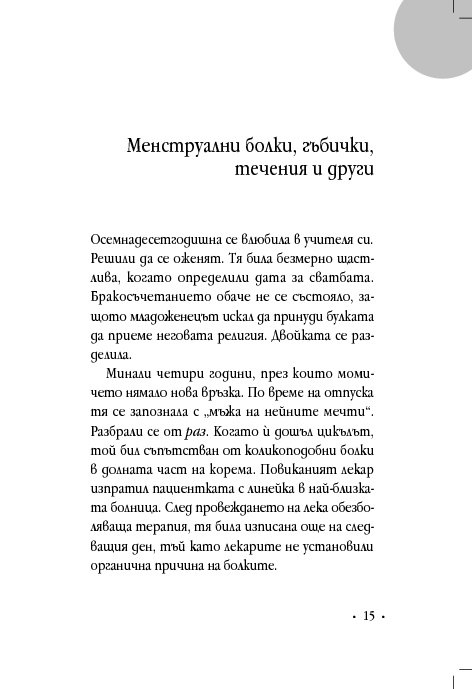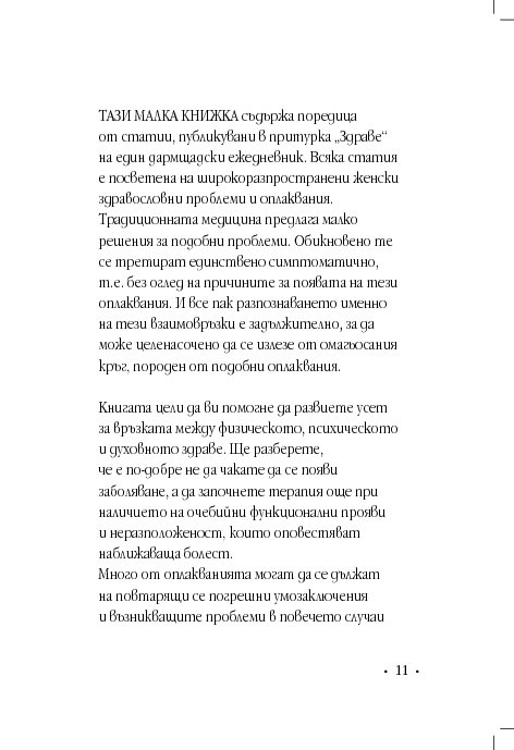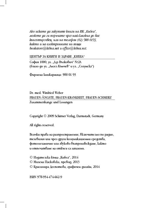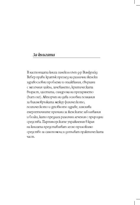 Гинекологът д-р Винфрийд Вебер прави кратък преглед на различни женски здравословни проблеми и оплаквания, свързани с месечния цикъл, зачеването, критическата възраст, цистита, синдрома на прегарянето (burn out). Авторът ни дава основни познания за взаимовръзката между физическото, психическото и духовното здраве, изяснява енергетичните причини за женските заболявания и болки, като предлага различни лечения с природни средства, а партньорските упражнения са лесно приложимо средство за самопомощ.