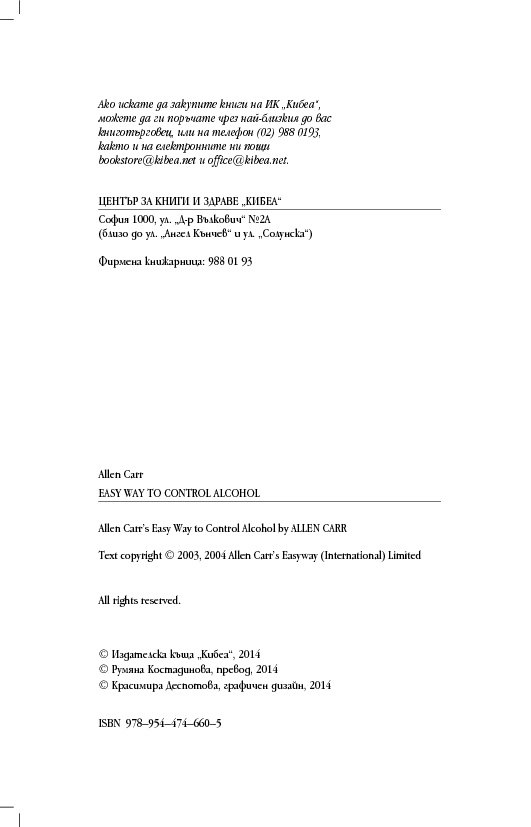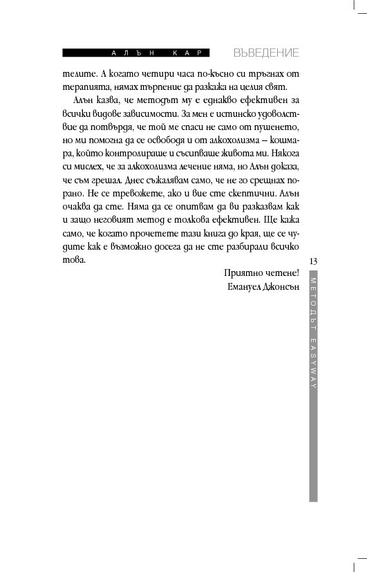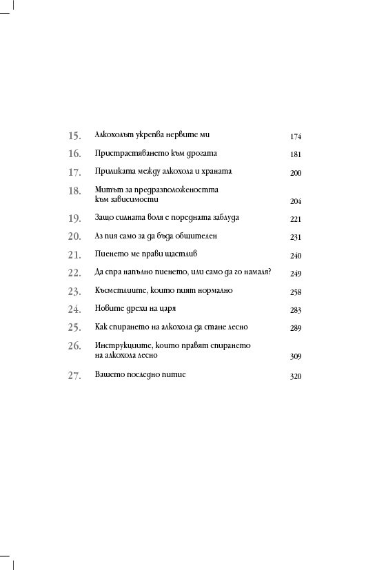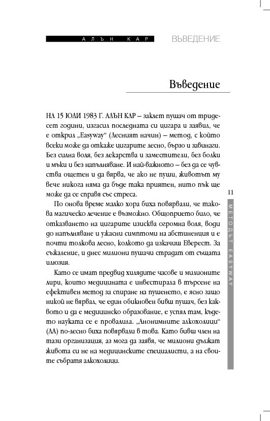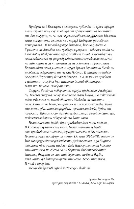 Едно отворено съзнание лесно може да съзре митотворчеството, свързано с пристрастяващите вещества. Затова едно от най-важните послания на автора е: отворете ума си! Отвореният ум вижда реалността на проблема с алкохола по коренно различен начин. И магията на тази книга е в това, че веднъж осъзнал естеството на пристратеността си (независимо дали става дума за цигари, алкохол или храна), веднъж прозрял натрупаните илюзии и обществени нагласи, веднъж добил познание за механизма на зависимостта си, човек няма как да се върне назад. Той вече има познанието. Методът на Алън Кар е ясен, прост и ефективен.