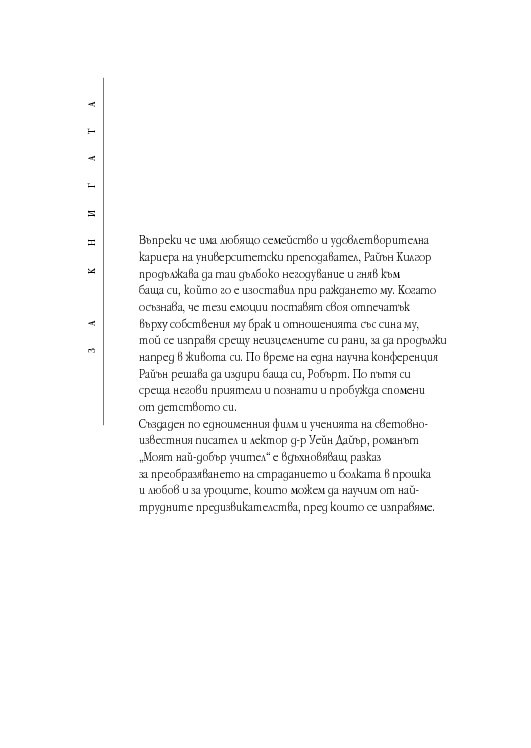 Създаден по едноименния филм и ученията на световноизвестния писател и лектор д-р Уейн Дайър, романът „Моят най-добър учител“ е вдъхновяващ разказ за преобразяването на страданието и болката в прошка и любов и за уроците, които можем да научим от най-трудните предизвикателства, пред които се изправяме.