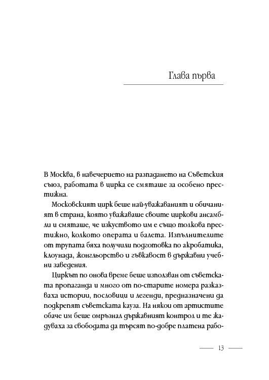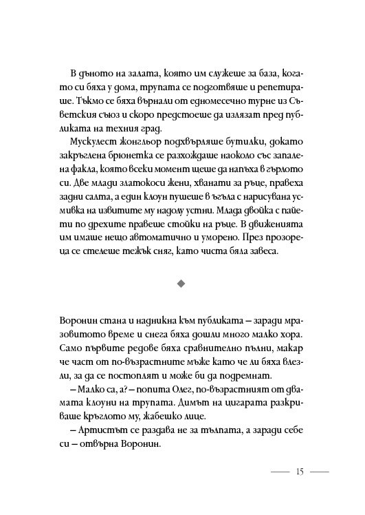Всички те – огнегълтачката Мариска, която пуши цигара след цигара, влюбените и уморени от пътя акробати Лев и Ирина, милата и свенлива гимнастичка Светлана, клоуните-интриганти Олег и Дмитрий – допринасят за едно незабравимо пътуване на надежда и вдъхновение.