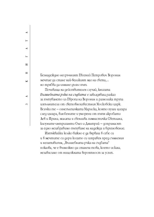 Почиваща на действителен случай, книгата „Вълшебната ръка на съдбата“ е завладяващ разказ за пътуването из Европа на Воронин и разнолика трупа изпълнители от световноизвестния Московски цирк.