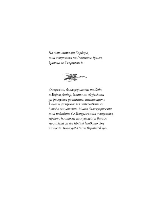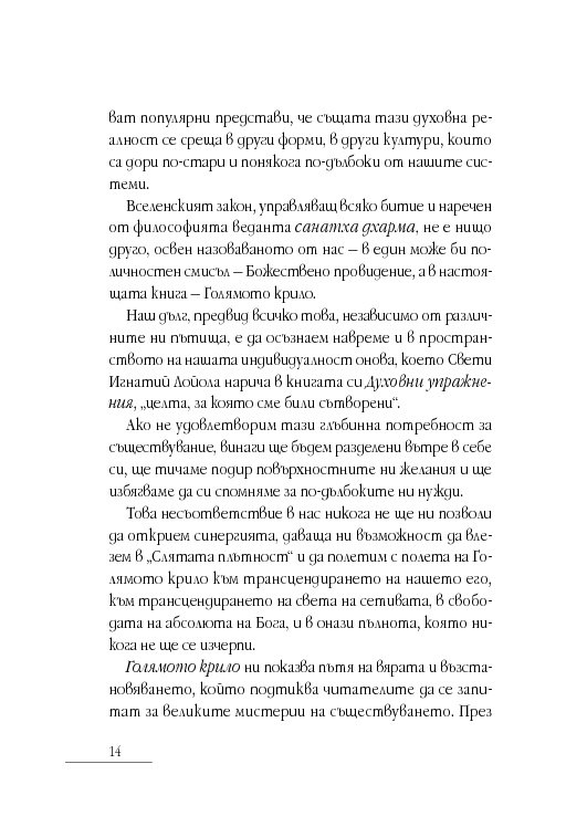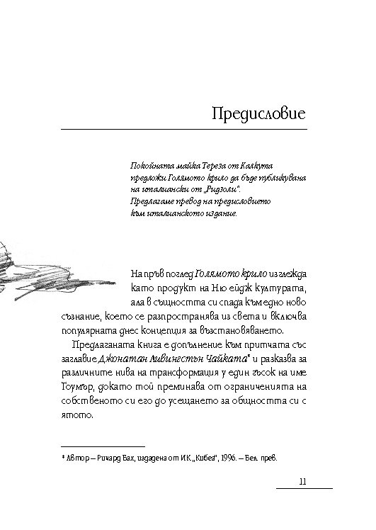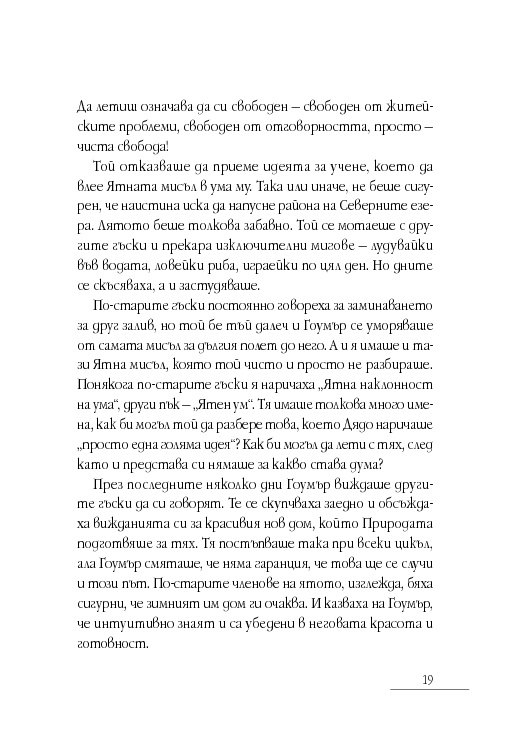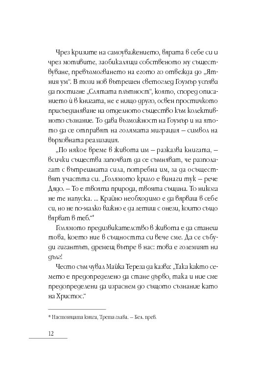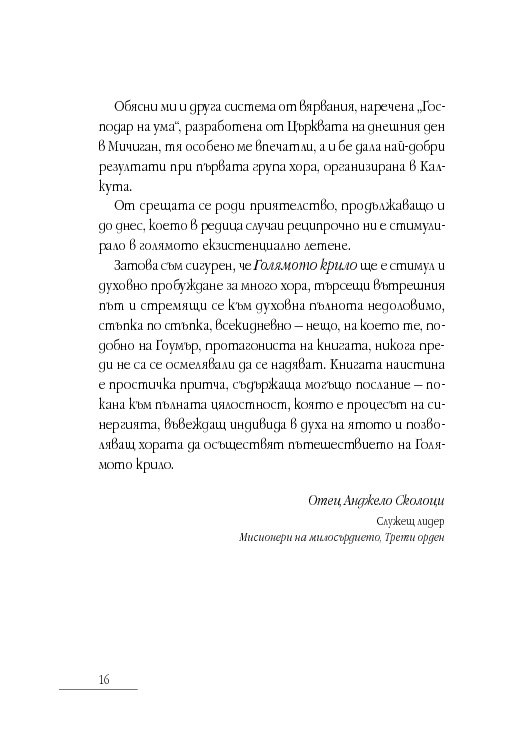 Голямото крило утвърждава както нашия потенциал на отделни личности, така и силата на груповата молитва, или „Ятния ум“. Докато пътешестваме с този гъсок и неговото ято, преоткриваме факта, че свързваме собствения си потенциал с мощта на общото благо посредством ценности като честността, надеждата, куража, доверието, постоянството, духовността и служенето. Изпитанията и горестите на младия гъсок, а също и триумфът му, са и наши собствени.