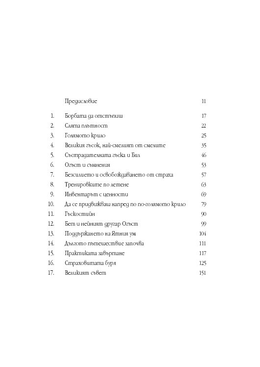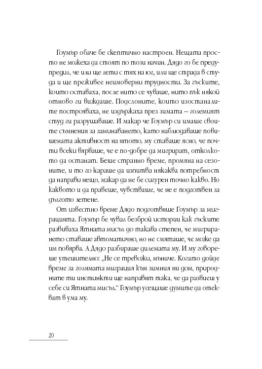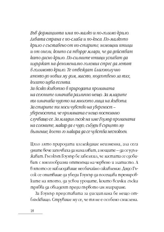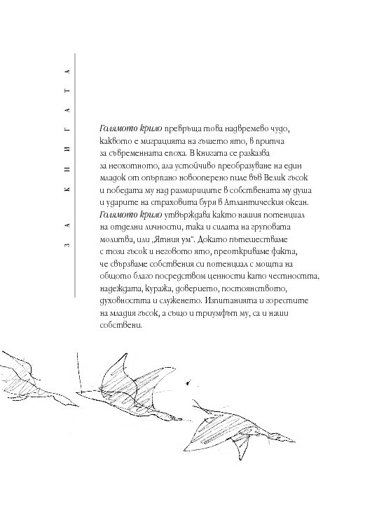 Голямото крило превръща това надвремево чудо, каквото е миграцията на гъшето ято, в притча за съвременната епоха. В книгата се разказва за неохотното, ала устойчиво преобразуване на един младок от опърпано новооперено пиле във Велик гъсок и победата му над размириците в собствената му душа и ударите на страховита буря в Атлантическия океан.