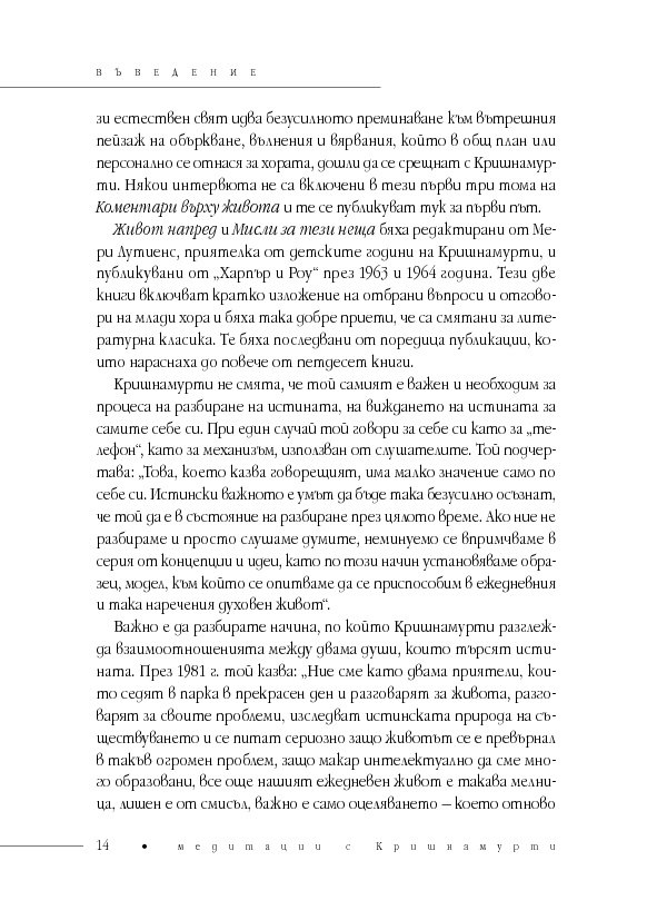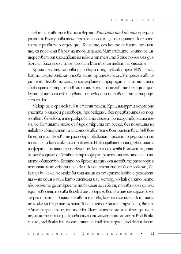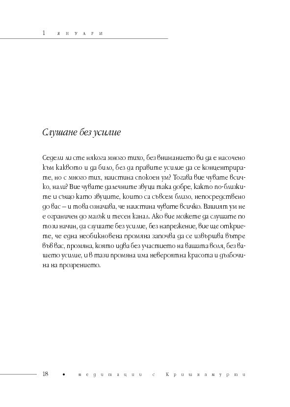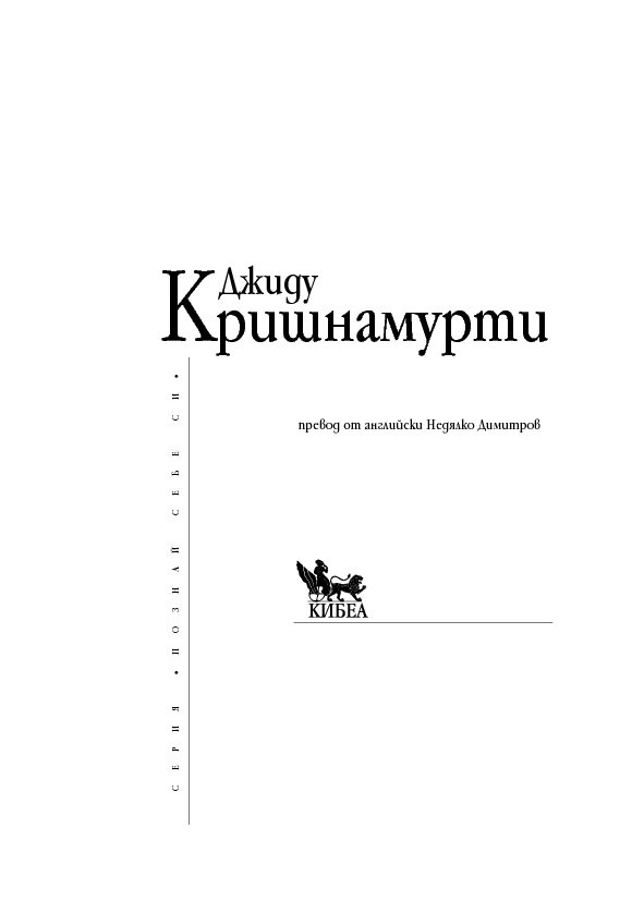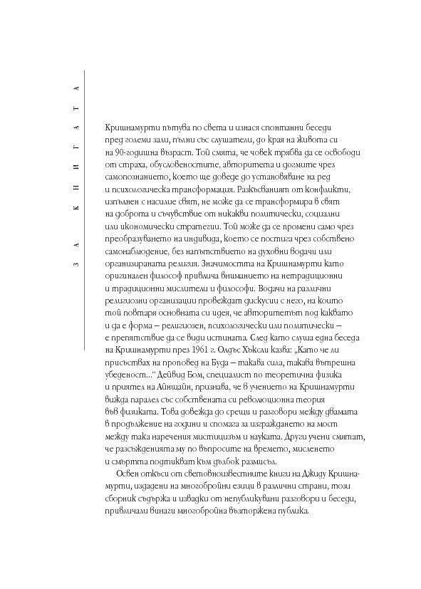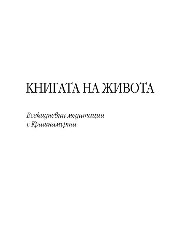 Освен откъси от световноизвестните книги на Джиду Кришнамурти, издадени на многобройни езици в различни страни, този сборник съдържа и извадки от непубликувани разговори и беседи, привличали винаги многобройна възторжена публика.