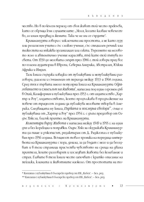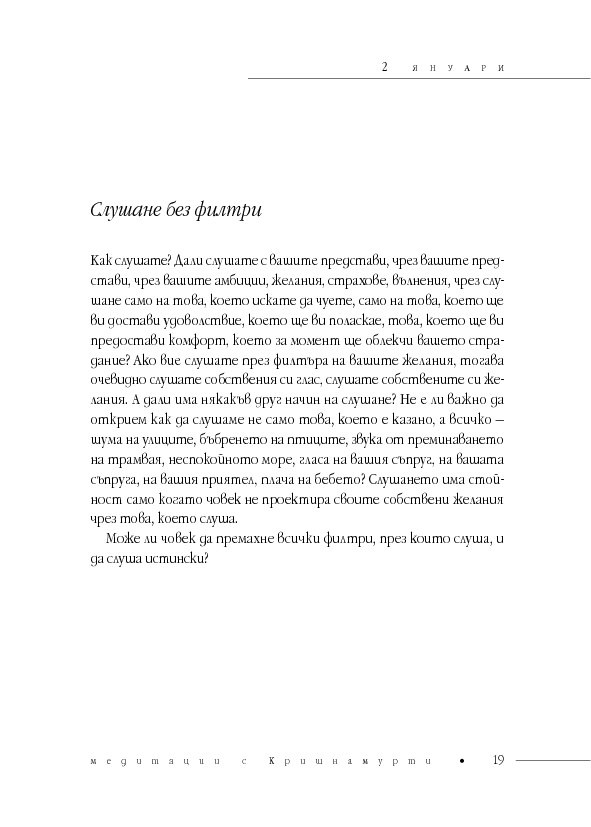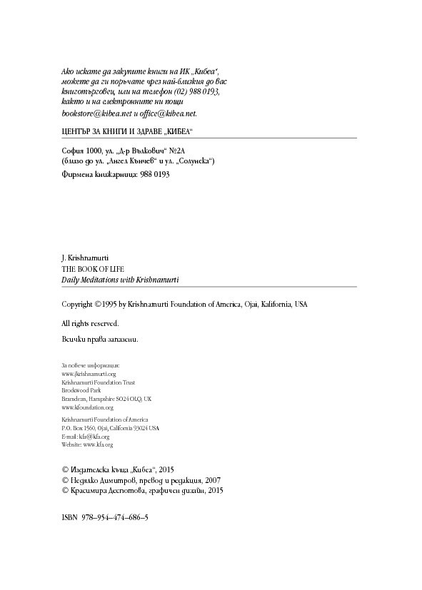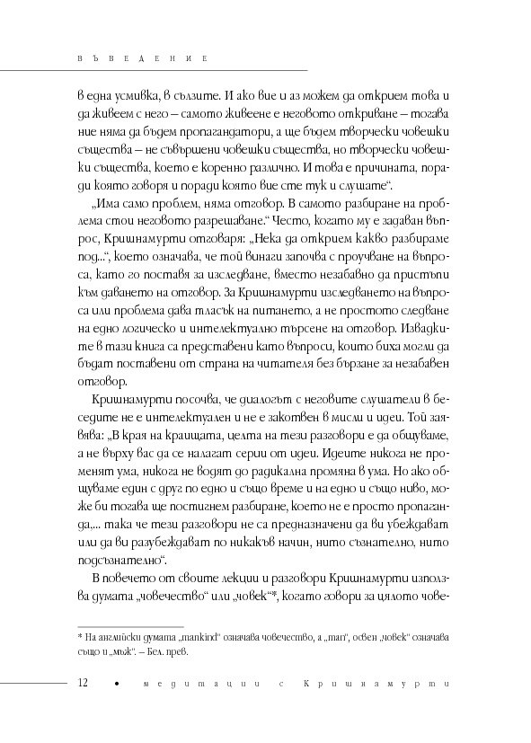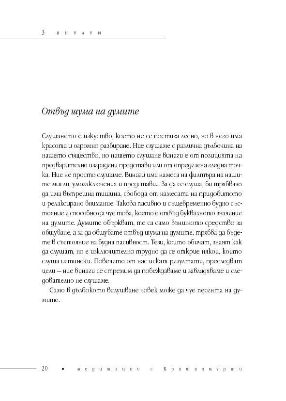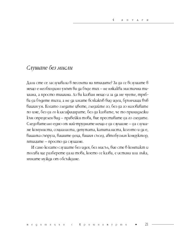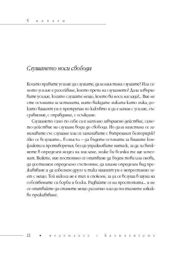 Освен откъси от световноизвестните книги на Джиду Кришнамурти, издадени на многобройни езици в различни страни, този сборник съдържа и извадки от непубликувани разговори и беседи, привличали винаги многобройна възторжена публика.