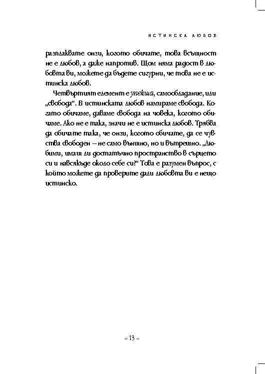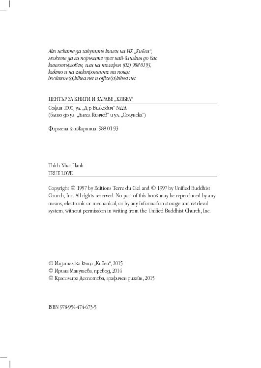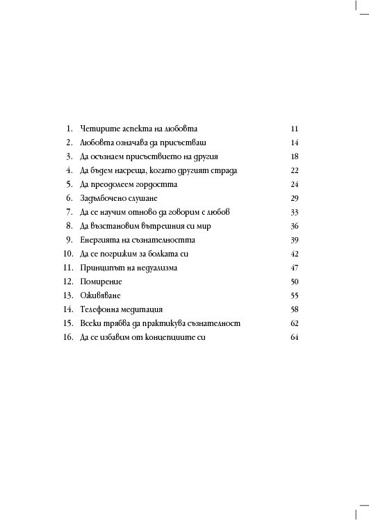 Простичко, топло и откровено той ни представя четирите основни аспекта на любовта, описани в будистката традиция: любяща доброта, състрадание, радост и свобода, и ни показва как да ги преживяваме всеки ден от живота си. Книгата ни насочва как да обичаме истински, като първо се научим да присъстваме в живота си, а впоследствие ни разкрива прости техники от будистката традиция, които всеки може да използва, за да създаде условията, необходими за любовта.