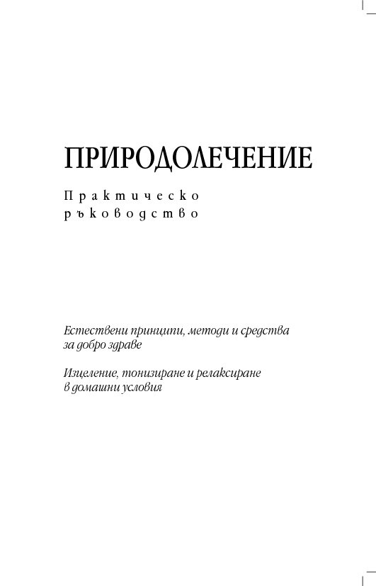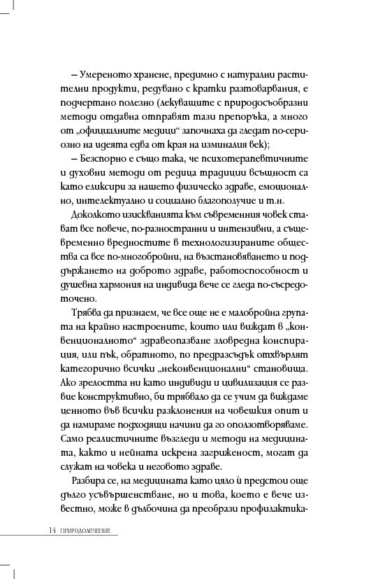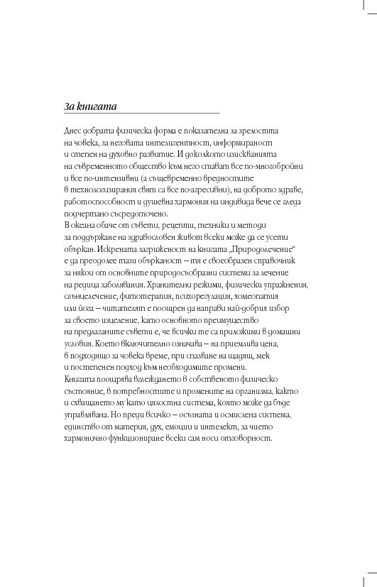 „Изключително съдържателна, „Природолечение – практическо ръководство“ разглежда човешкото здраве като холистична система с нейните многообразни аспекти – духовни, психични, афективни, поведенчески, социални. За разлика от ориентирания към симптомите, частичен и „на парче“ подход на конвенционалната медицина, цялостната визия, споделяна от автора, се опира на идеята за огромния потенциал на човешката душевност. Отчита се взаимовръзката между възприемането на реалността, мислите и емоциите на човека като определяща неговото здравословно състояние. Четенето на тази книга е своеобразно вглеждане в самия себе си, във вътрешния потенциал за пълноценен и здравословен живот – живот, изпълнен със здраве и благоденствие!“