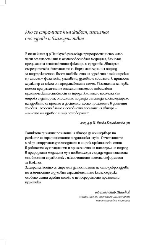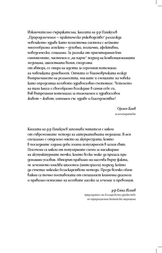 „Д-р Пашкулев разглежда природолечението като част от цялостната и научнообоснована медицина, базирана предимно на естествените фактори и средства. Авторът съсредоточава вниманието си върху интегралния подход за поддържането и възстановяването на здравето в най-широкия му смисъл – физическо, умствено, духовно и социално. С приносен характер са някои от представените схеми. Указанията за първа помощ при различните описани патологии повишават практическата стойност на труда. Книгата е насочена към широка аудитория, описаните подходи и методи за стимулиране на здравето са прости и достъпни, лесно приложими в домашни условия. Особено важно е основното послание на автора – личното ни здраве е лична отговорност.“