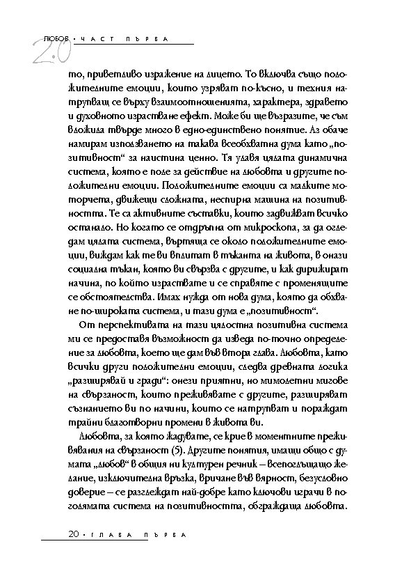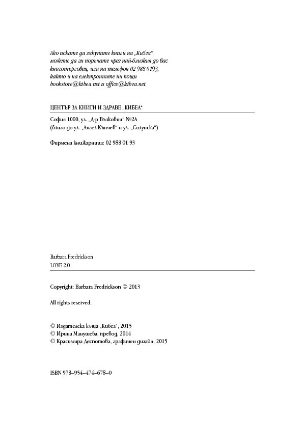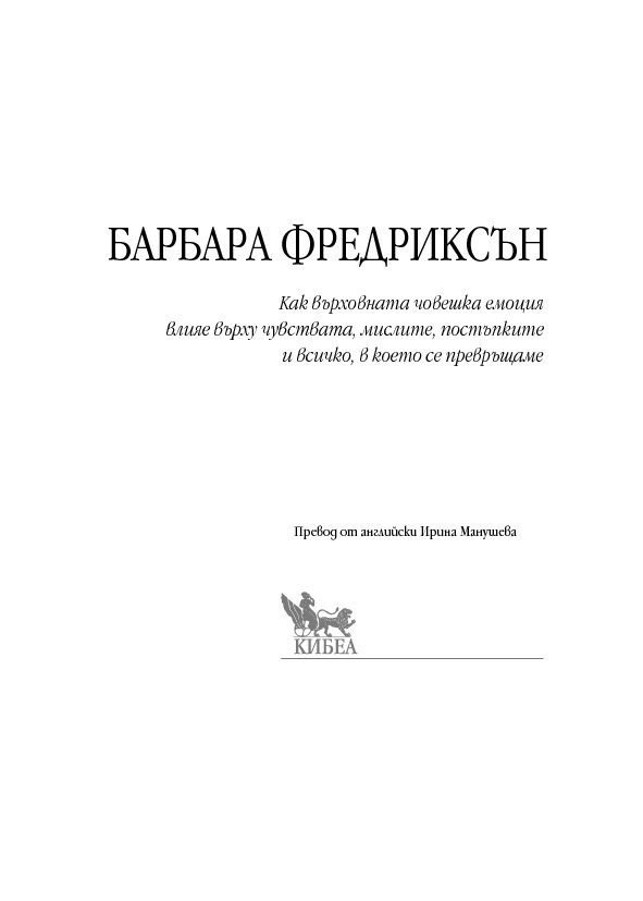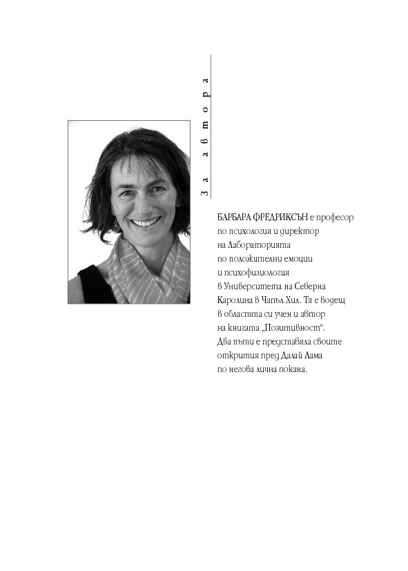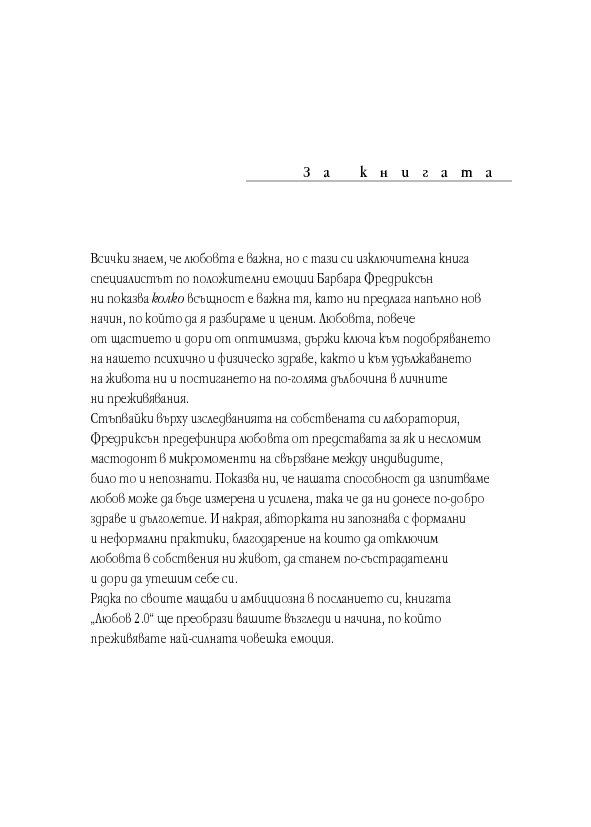 Всички знаем, че любовта е важна, но с тази си изключителна книга специалистът по положителни емоции Барбара Фредриксън ни показва колко всъщност е важна тя, като ни предлага напълно нов начин, по който да я разбираме и ценим. Любовта, повече от щастието и дори от оптимизма, държи ключа към подобряването на нашето психично и физическо здраве, както и към удължаването на живота ни и постигането на по-голяма дълбочина в личните ни преживявания.