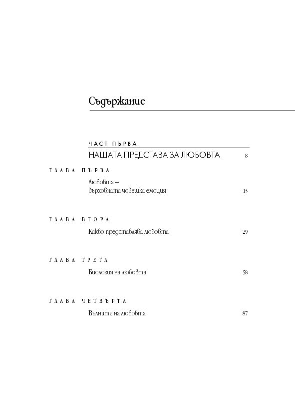 Стъпвайки върху изследванията на собствената си лаборатория, Фредриксън предефинира любовта от представата за як и несломим мастодонт в микромоменти на свързване между индивидите, било то и непознати. Показва ни, че нашата способност да изпитваме любов може да бъде измерена и усилена, така че да ни донесе по-добро здраве и дълголетие. И накрая, авторката ни запознава с формални и неформални практики, благодарение на които да отключим любовта в собствения ни живот, да станем по-състрадателни и дори да утешим себе си.