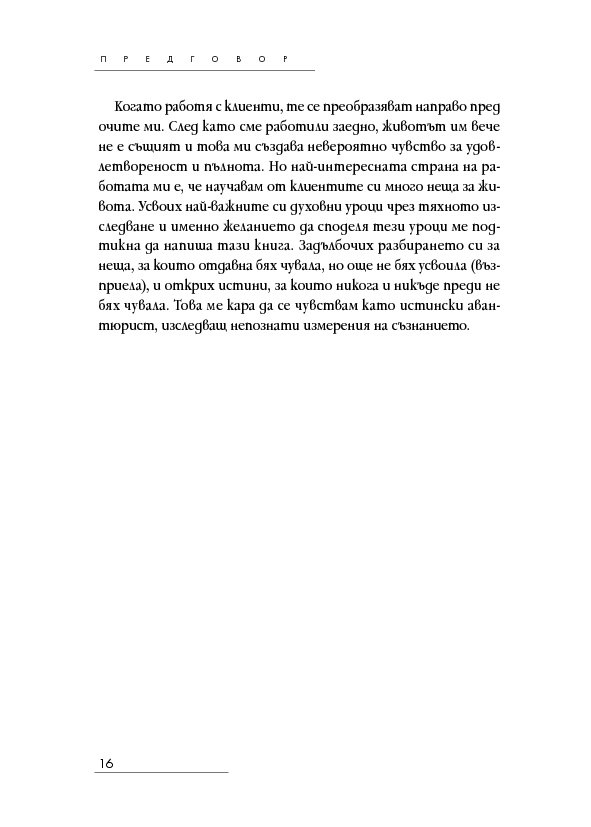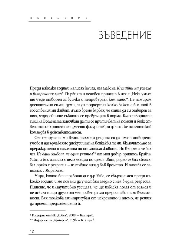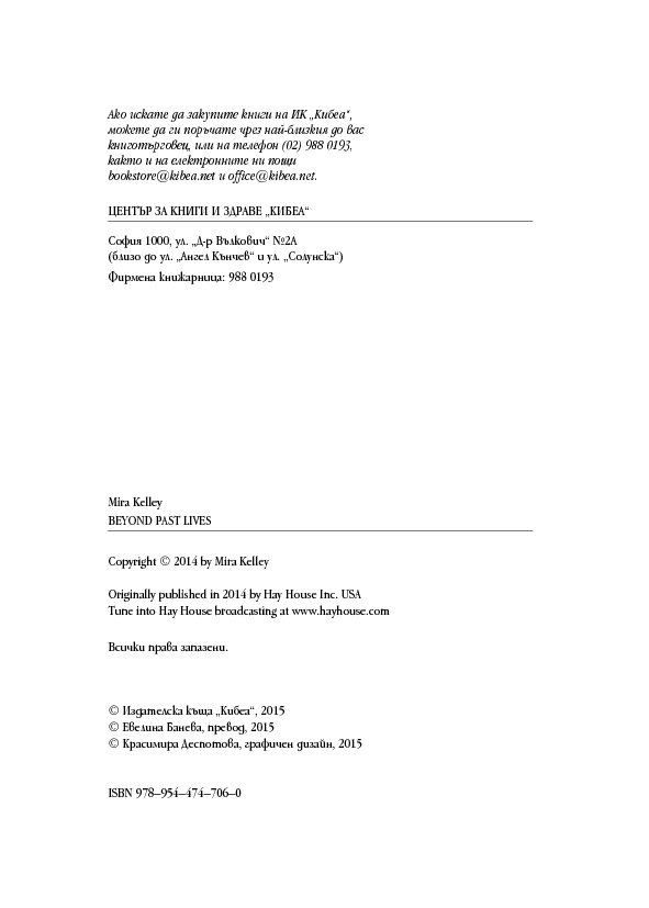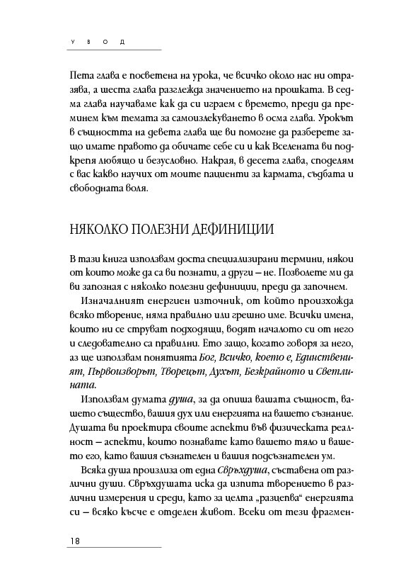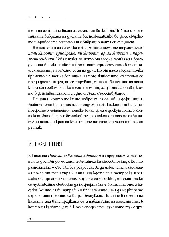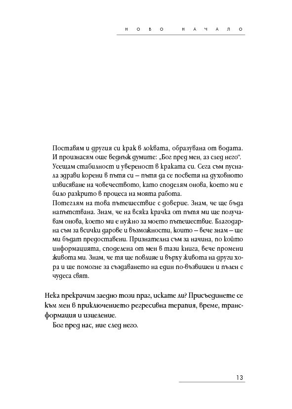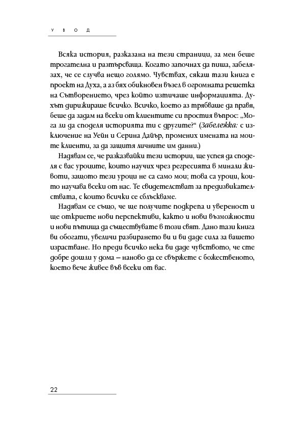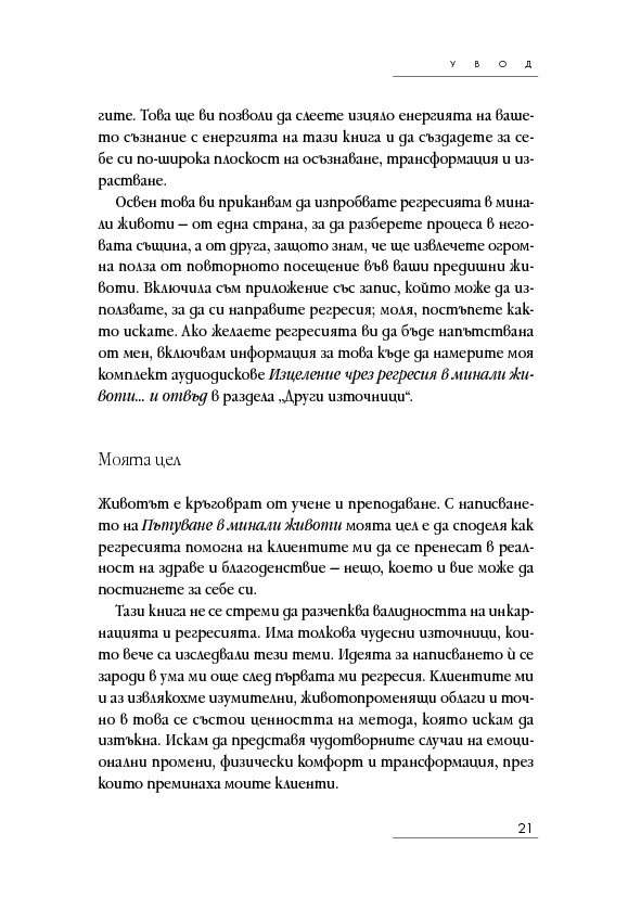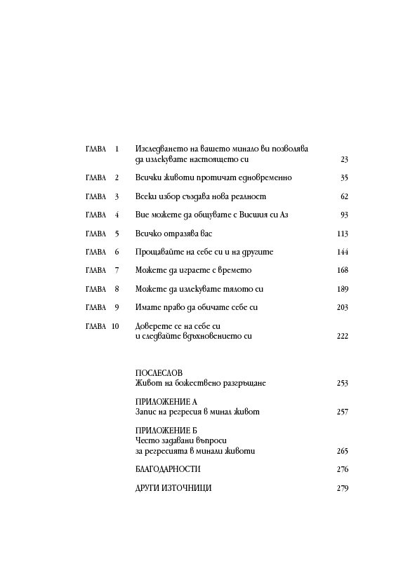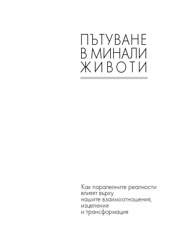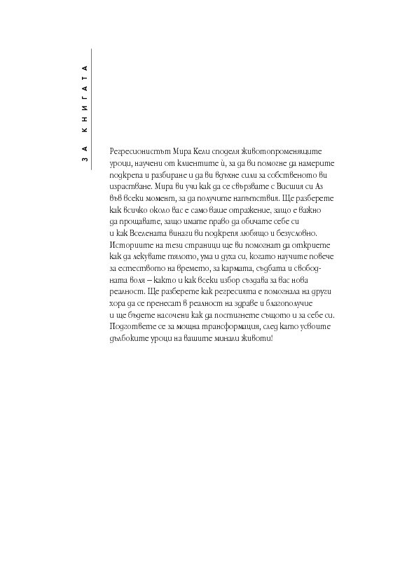 Историите на тези страници ще ви помогнат да откриете как да лекувате тялото, ума и духа си, когато научите повече за естеството на времето, за кармата, съдбата и свободната воля – както и как всеки избор създава за вас нова реалност. Ще разберете как регресията е помогнала на други хора да се пренесат в реалност на здраве и благополучие и ще бъдете насочени как да постигнете същото и за себе си.