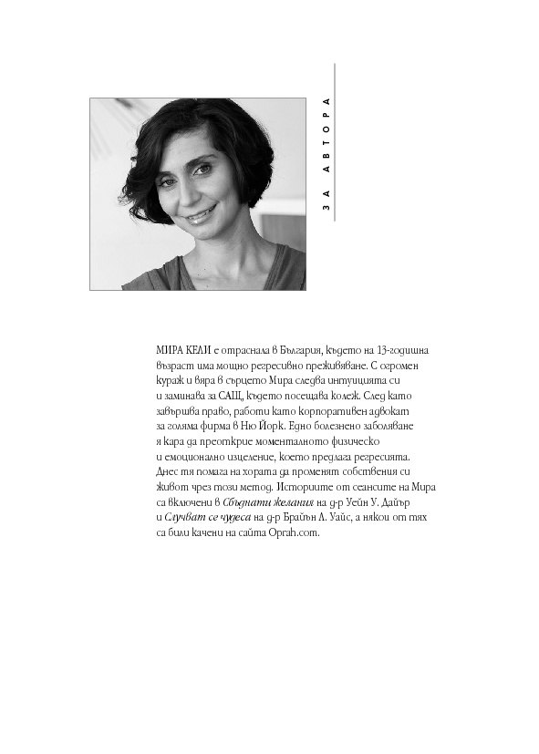 Регресионистът Мира Кели споделя животопроменящите уроци, научени от клиентите ѝ, за да ви помогне да намерите подкрепа и разбиране и да ви вдъхне сили за собственото ви израстване. Мира ви учи как да се свързвате с Висшия си Аз във всеки момент, за да получите напътствия. Ще разберете как всичко около вас е само ваше отражение, защо е важно да прощавате, защо имате право да обичате себе си и как Вселената винаги ви подкрепя любящо и безусловно.