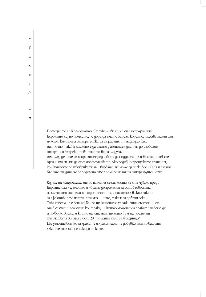 Това съвсем не е всичко! Какво ще кажете за упражнения, състоящи се от 6-секундни мускулни контракции, които можете да правите навсякъде и по всяко време, и които ще стегнат тялото ви и ще увеличат физическата ви сила с цели 20 процента само за 4 седмици? Ще узнаете всичко за храните и хранителните добавки, което вашият лекар не знае или не иска да ви каже.