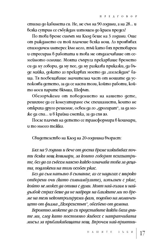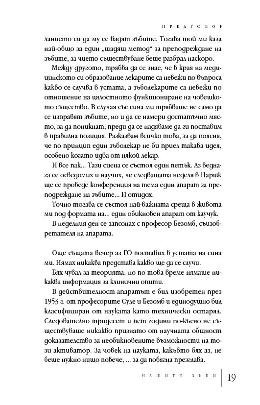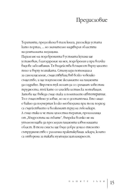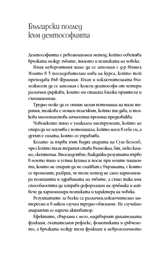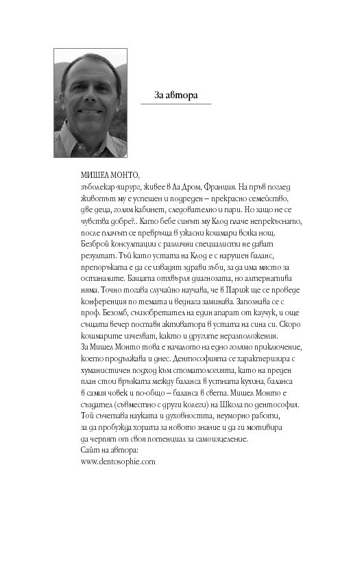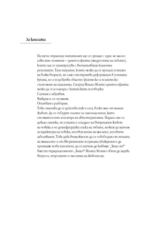 На тези страници читателят ще се срещне с едно не много известно понятие – дентософията (мъдростта на зъбите), което ще го заинтригува с впечатляващи клинични резултати. Тази терапия, която може да се прилага успешно на всяка възраст, не само отстранява деформации в устната кухина, но и подобрява общото физическо и психическо състояние на пациента. Според Мишел Монто дентософията може да се асоциира с китайската поговорка: