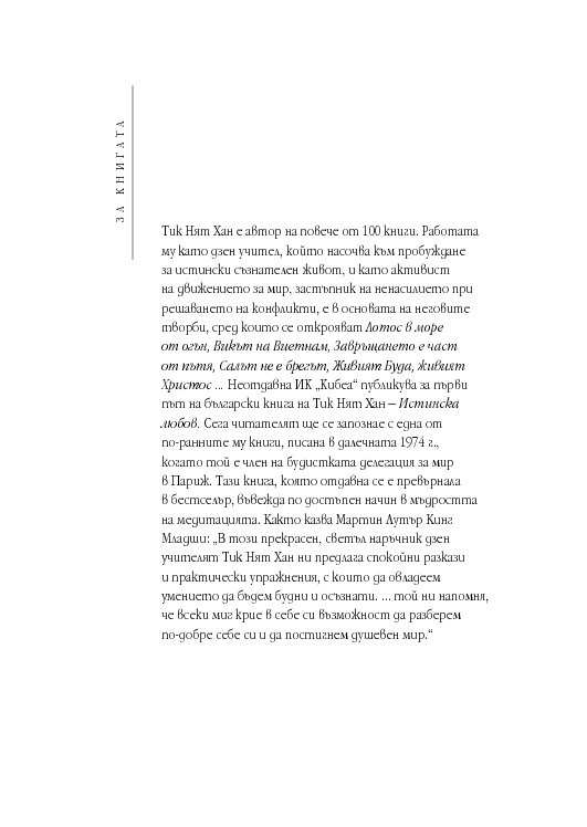 ИК КИБЕА публикува за първи път на български основополагащия труд на Тик Нят Хан „Истинска любов“. „Чудото на осъзнатия живот“ е сред по-ранните му книги – написана е в далечната 1974 г., когато той е член на будистката делегация за мир в Париж. Тази книга, която отдавна се е превърнала в бестселър, въвежда по достъпен начин в мъдростта на медитацията. Както казва Мартин Лутър Кинг Младши: „В този прекрасен, светъл наръчник дзен учителят Тик Нят Хан ни предлага спокойни разкази и практически упражнения, с които да овладеем умението да бъдем будни и осъзнати. Той ни напомня, че всеки миг крие в себе си възможност да разберем по-добре себе си и да постигнем душевен мир“.