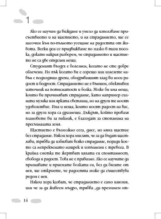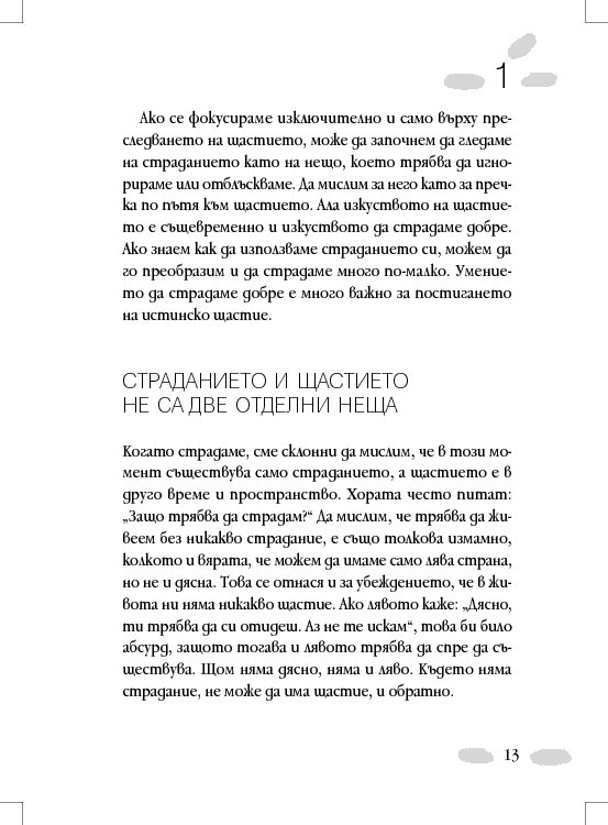 Всички ние искаме да бъдем щастливи. И въпреки това продължаваме да страдаме. Способността да се радваме на щастие не означава липса на всякакво страдание. Всъщност, изкуството на щастието е и изкуство на страданието.