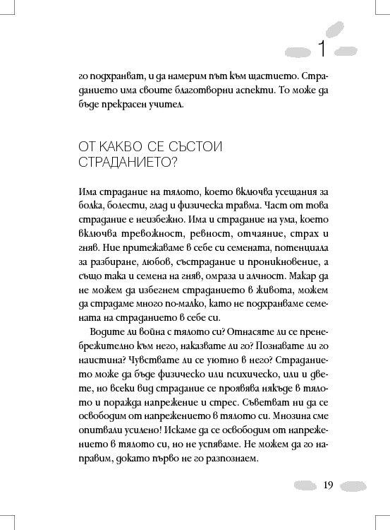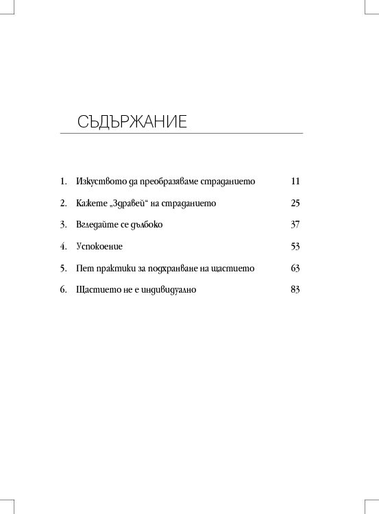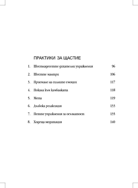 Книгата ни показва как с помощта на петте практики за освобождаване от привързаността, насърчаване на положителните семена, осъзнатост, концентрация и прозрение можем да приучим тялото и ума си на щастие и как да продължаваме да го подхранваме.