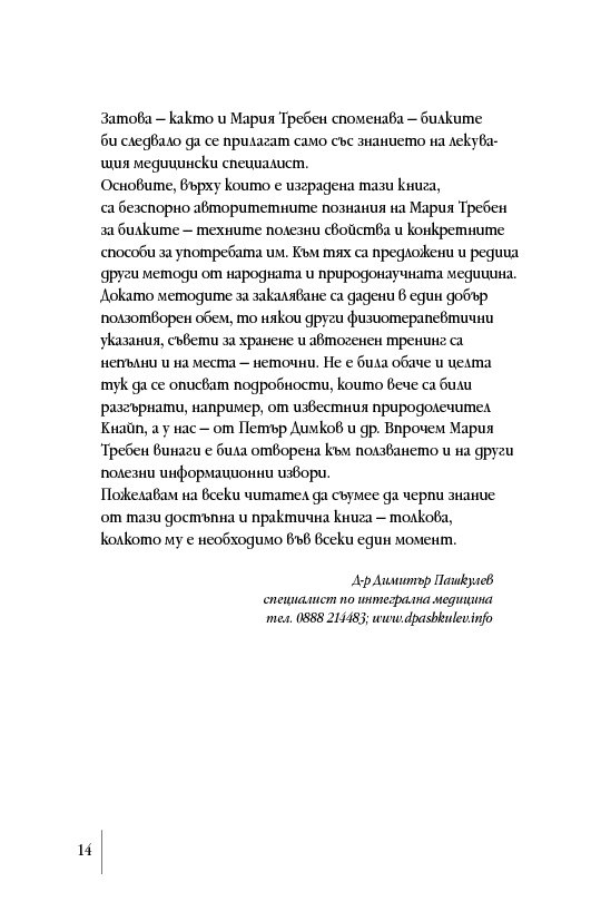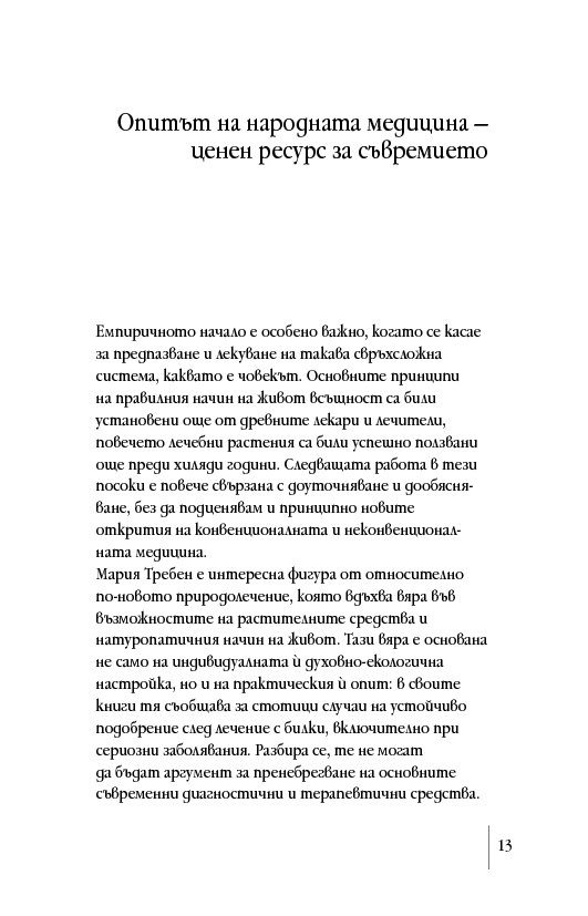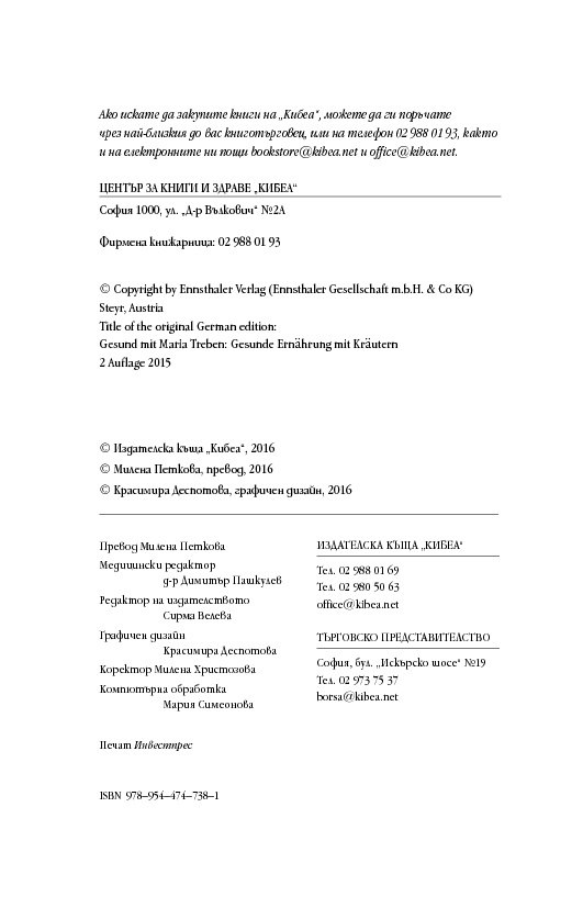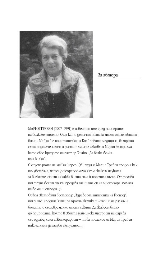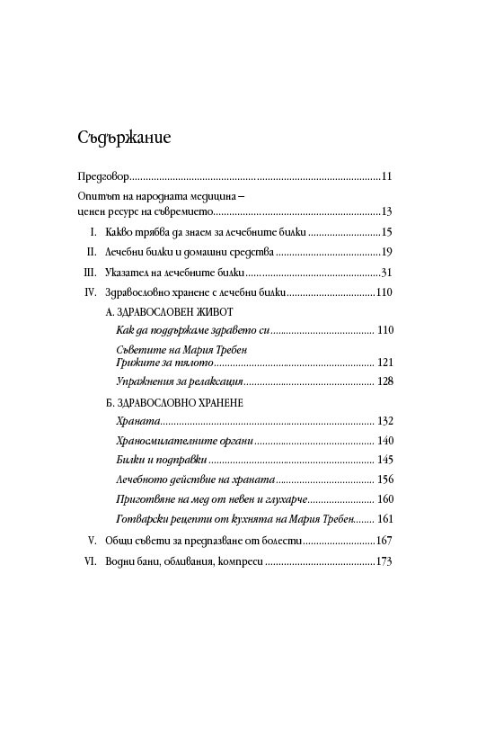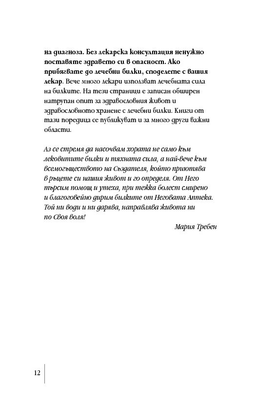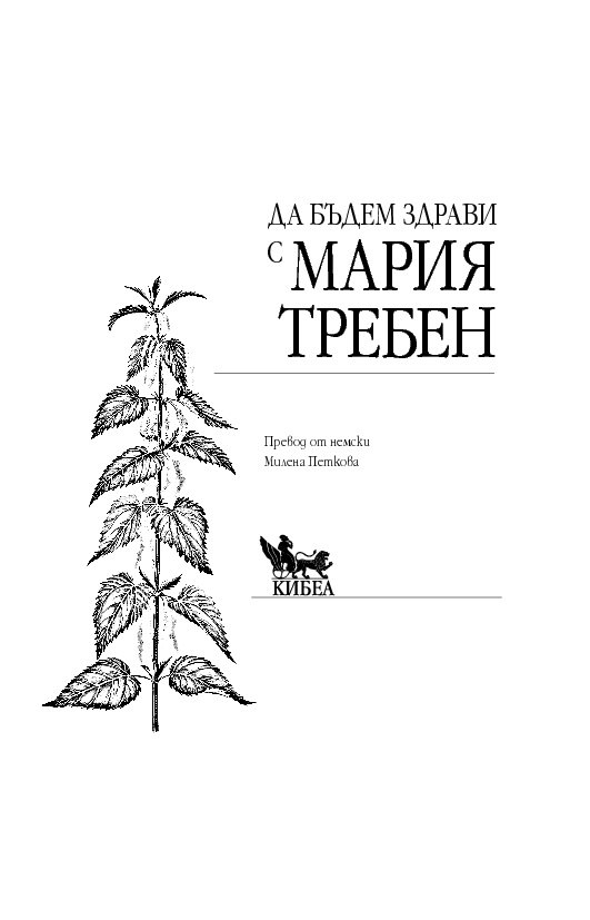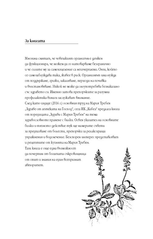 След като издаде (2014 г.) основния труд на Мария Требен „Здраве от аптеката на Господ“, сега ИК „Кибеа“ предлага книга от поредицата „Здрави с Мария Требен“ на тема здравословното хранене с билки. Освен указател на основните билки и тяхното действие тук ще намерите съвети за предпазване от болести, препоръки за релаксиращи упражнения и водолечение. Безспорен интерес представляват и рецептите от кухнята на Мария Требен.