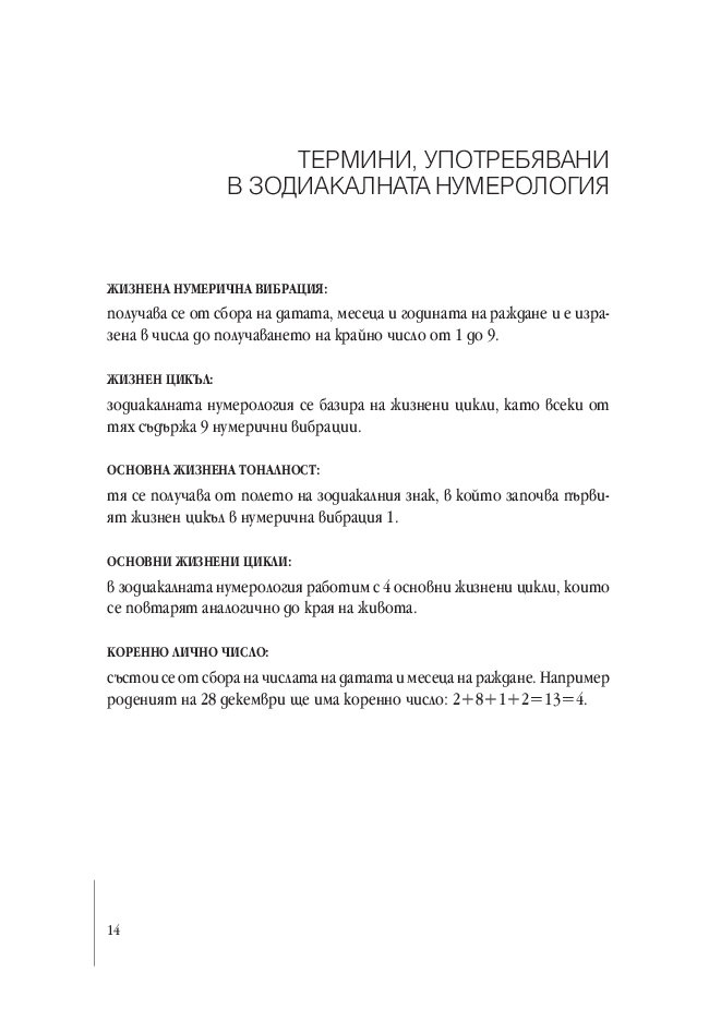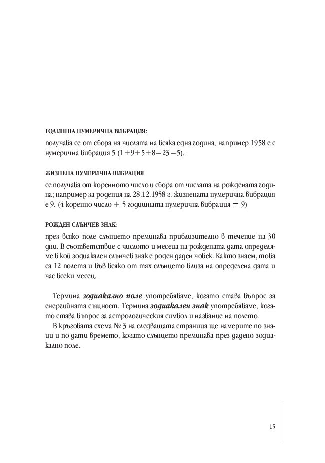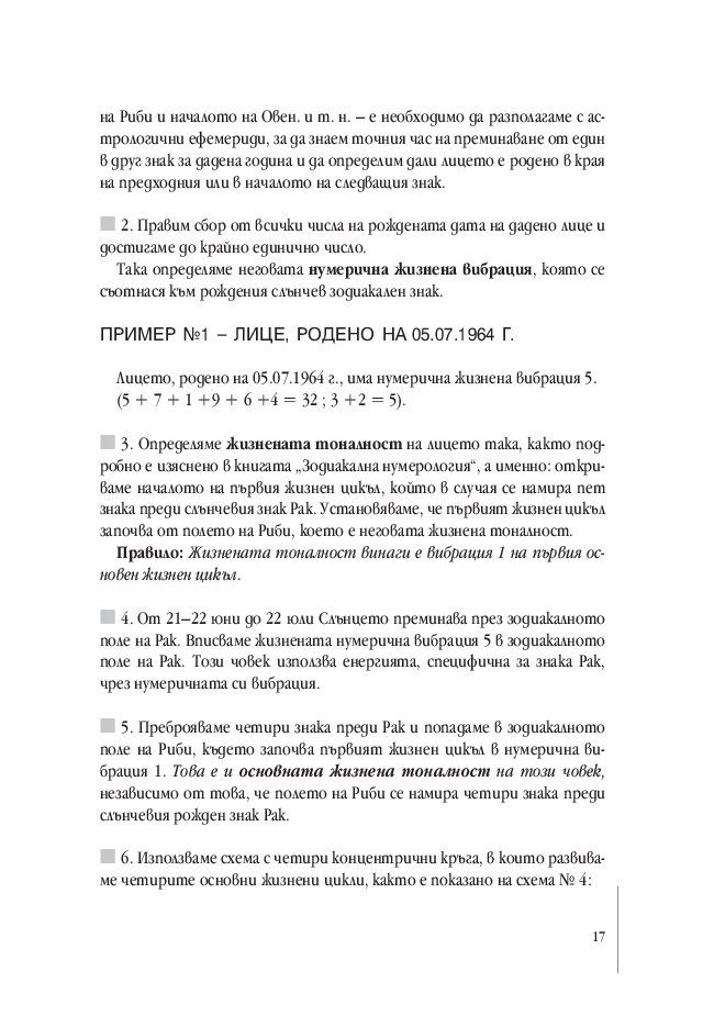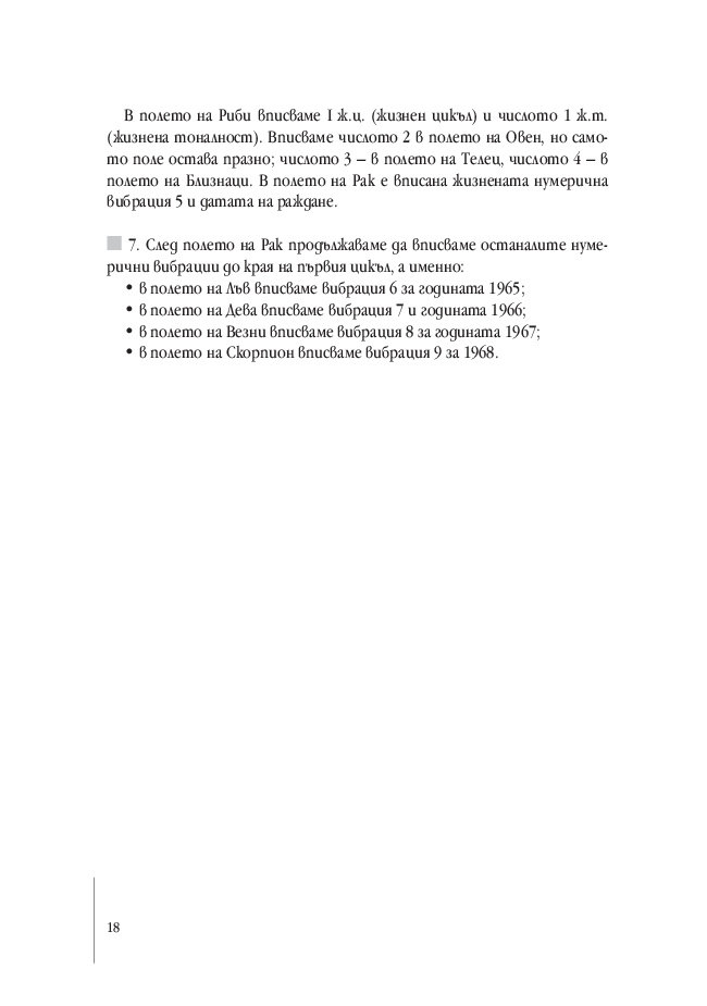 Представените в Ръководството примери са основа за систематично проследяване на жизнените цикли по години. Освен това се дават насоки за анализиране на всяка година по месеци, като се взема предвид спецификата на зодиакалния знак на годината и характеристиката на годишната нумерична вибрация.