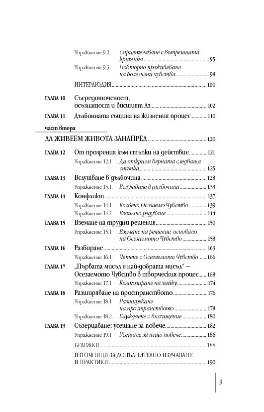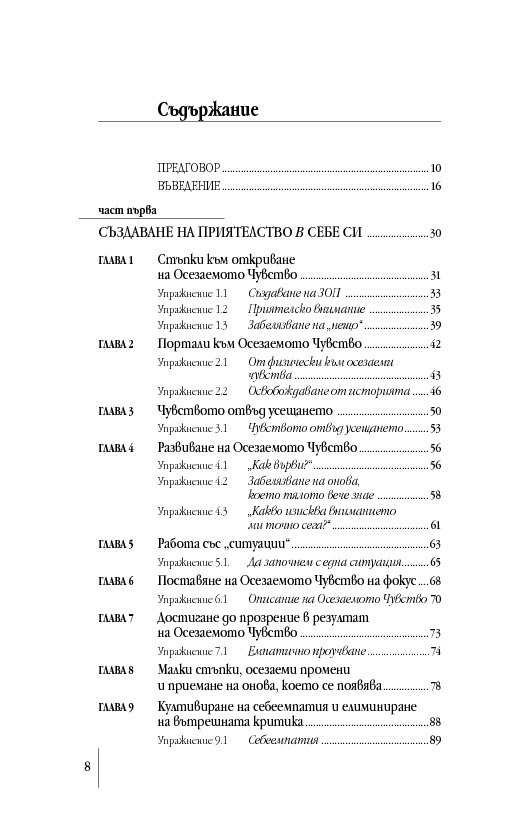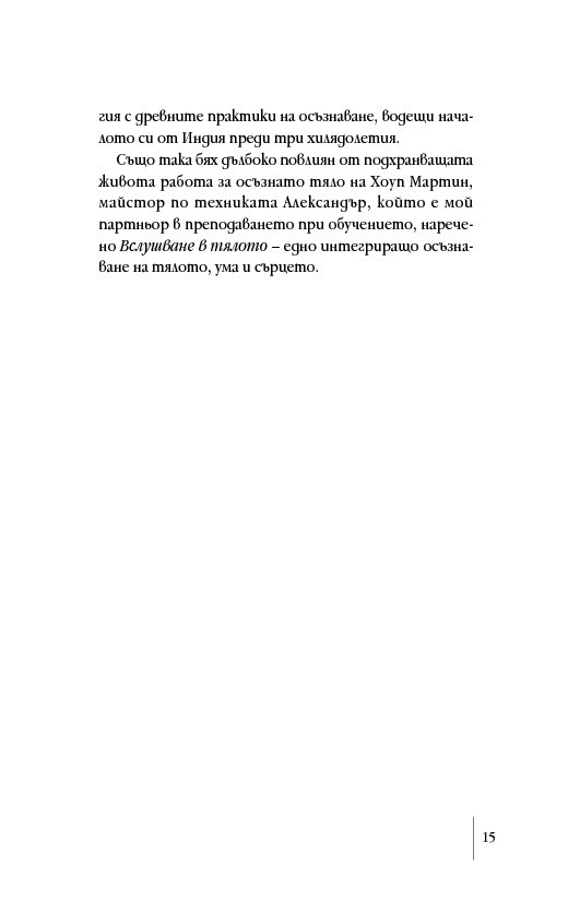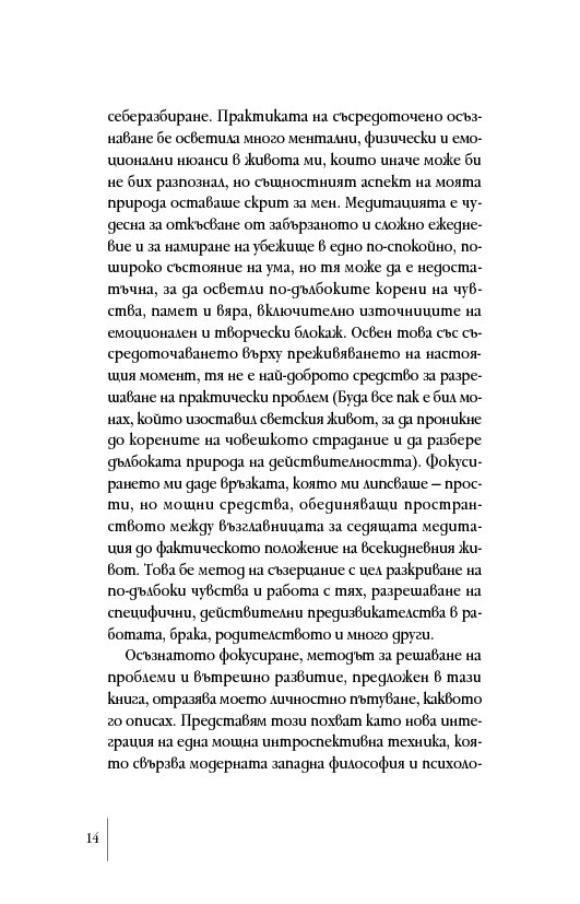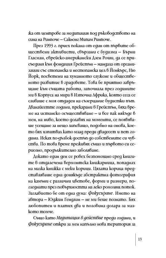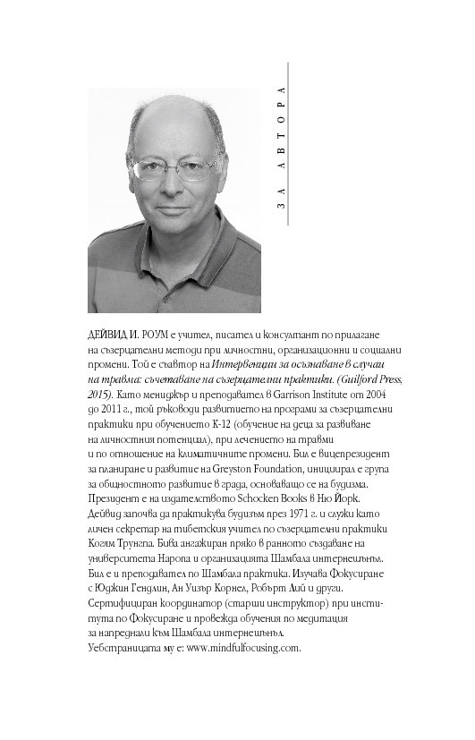„Прочитането на книгата на Дейвид Роум отключи забравено, но познато усещане в сърцето ми, което извика: „Да!“. Той ни връща към тялото, разкривайки как да се свържем с Осезаемото Чувство – неконцептуалното изживяване на онова познание, което носим и за което копнеем. Той ни води умело към цялост, представяйки достъпни упражнения като инструмент за цял живот. Осъзнатото фокусиране се появява в подходящ момент, наред с науките за осъзнаването, неврологията и социално-емоционалните изследвания, посочвайки ни как да свързваме медитацията с ежедневието, мозъка със сърцето, западната философия с източната мъдрост. Тази книга е съкровище, което да пазим и използваме отново и отново.“