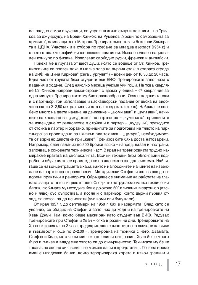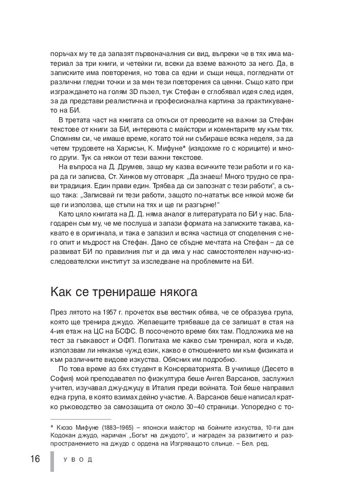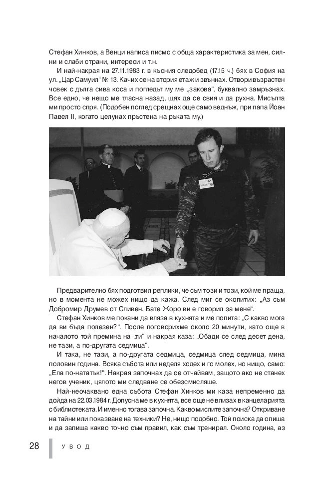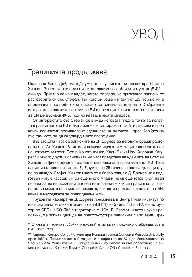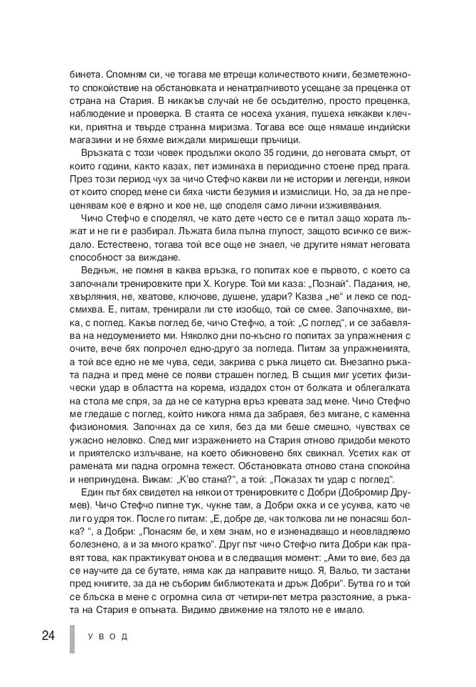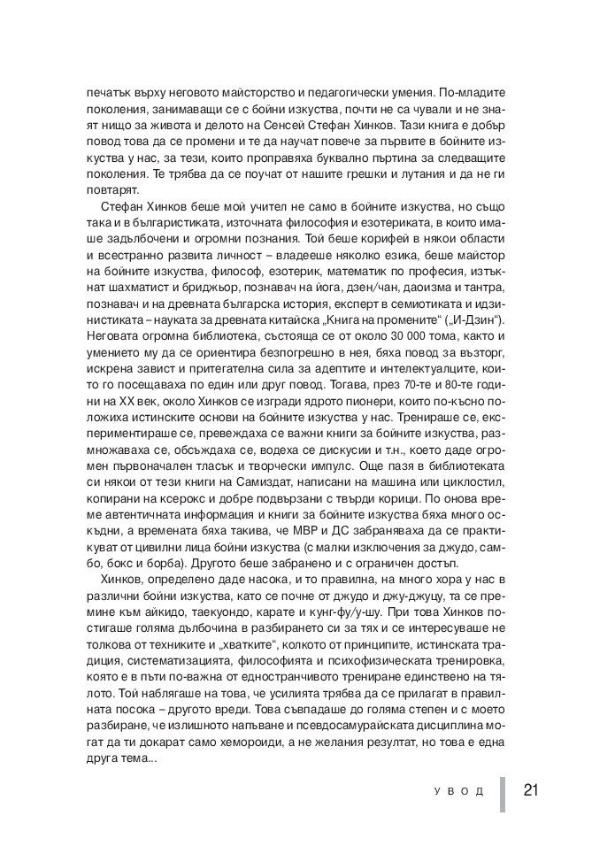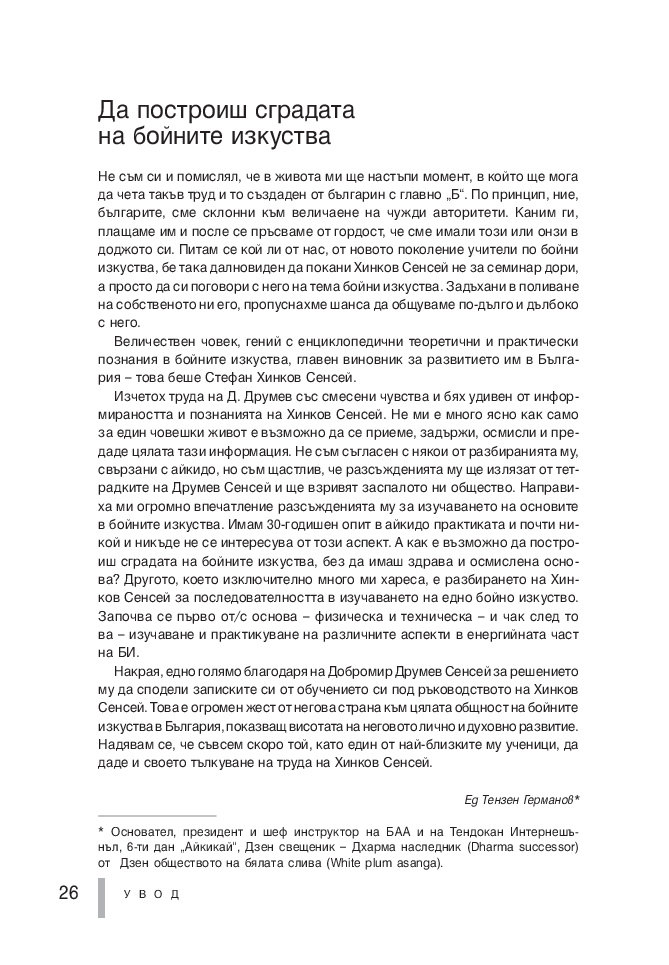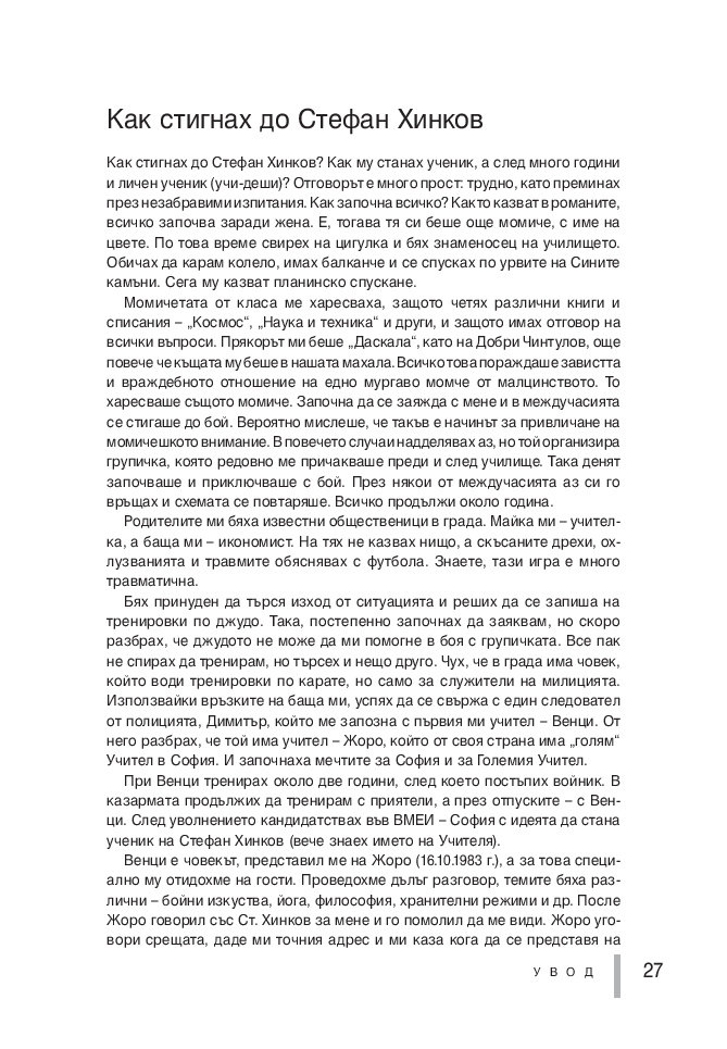 Д-р Добромир П. Друмев е събрал и записал не просто разговорите си със Сенсей Стефан Хинков, а е проследил създаването, налагането и разпространението, изпъстрено с многобройни перипетии и трудности, на източните бойни изкуства у нас легално и нелегално. Тяхната философия и практика навлизат с немногобройните и просъществували за кратко или по-дълго школи у нас, с българските треньори (майстори) и канените чуждестранни учители, с преведените за собствена употреба текстове за бойни изкуства.