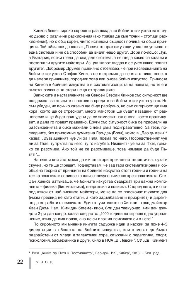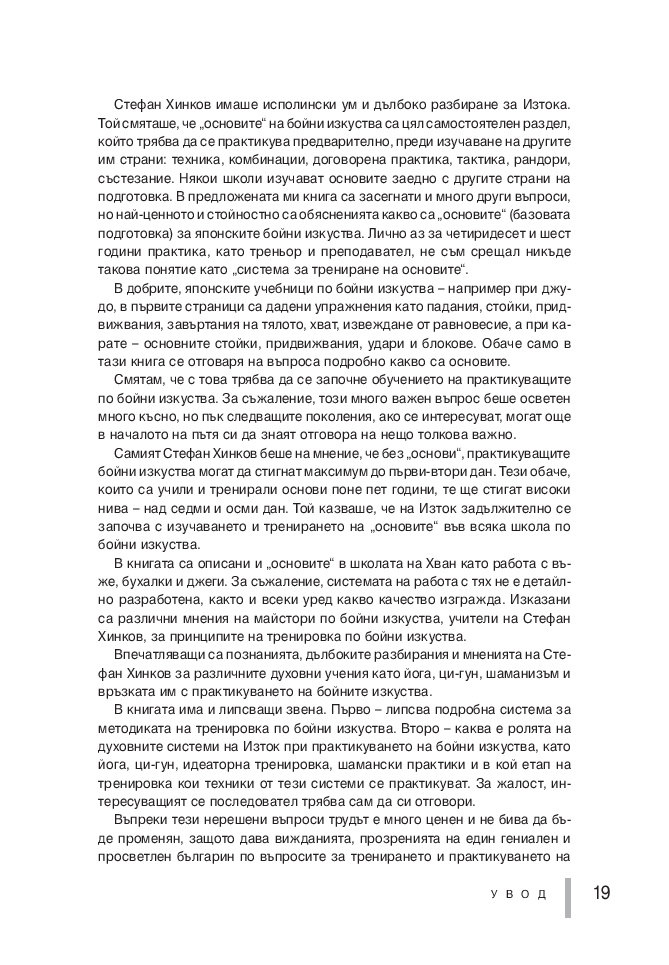 Сенсей Стефан Хинков е не само участник и съучастник, но и един от основоположниците на източните бойни изкуства в България. Ето защо „Размисли на Сенсей Стефан Хинков за бойните изкуства“ предлага идеи и духовност – не единствено упражнения или „хватки“, а систематизация и философски прозрения на основите на пътя на воина.