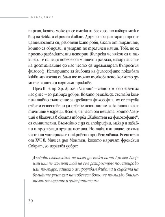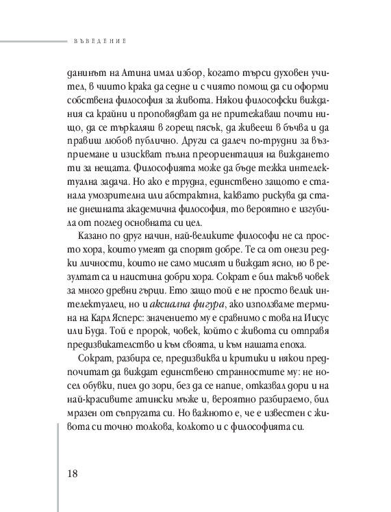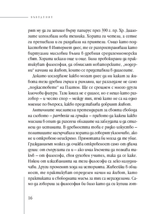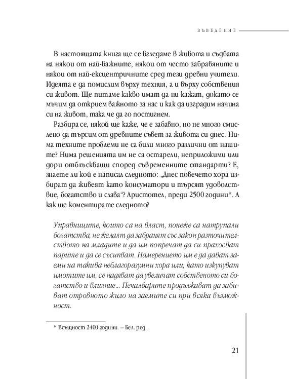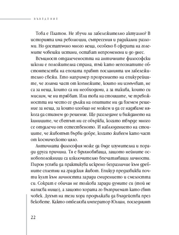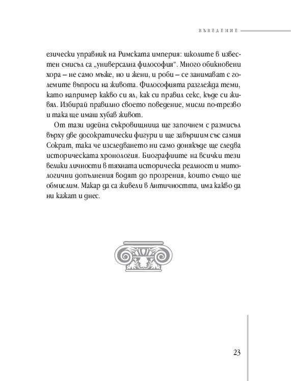 Много от темите, вълнуващи старите философи, стоят неразрешени и пред нас. Намираме ли нашия отговор днес? Понякога може би да, макар много от въпросите стоят все така зададени... Но благородството на ума, отдаден на истината, е може би най-впечатляващият урок на древността. Урок по водене на спор. Урок за измамността на славата. За секса и въздържанието. За удоволствията. За богатството от пътешествията. За смъртта.