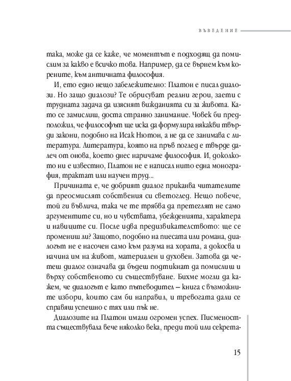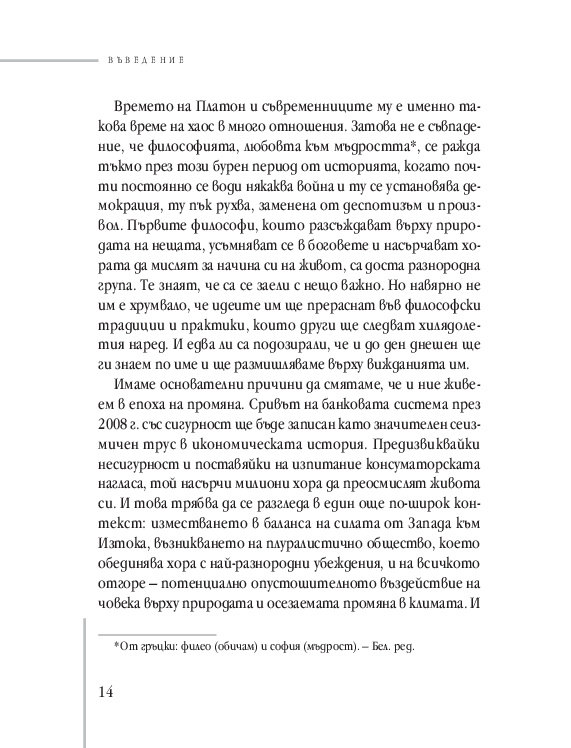 Да се наведеш и да отпиеш от древния извор на обичащите мъдростта (философите) наподобява чисто физическо усещане – чистота, свежест и прохлада. Чувство на истинност. Чувство на принадлежност към цивилизацията. Чувство на не-самота.