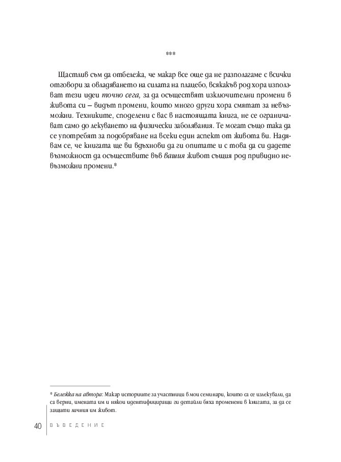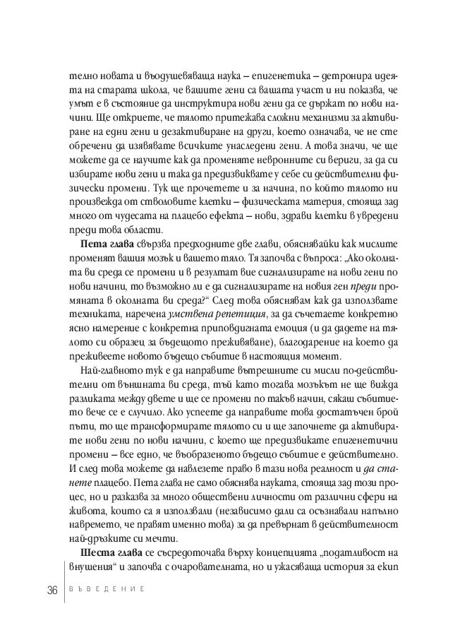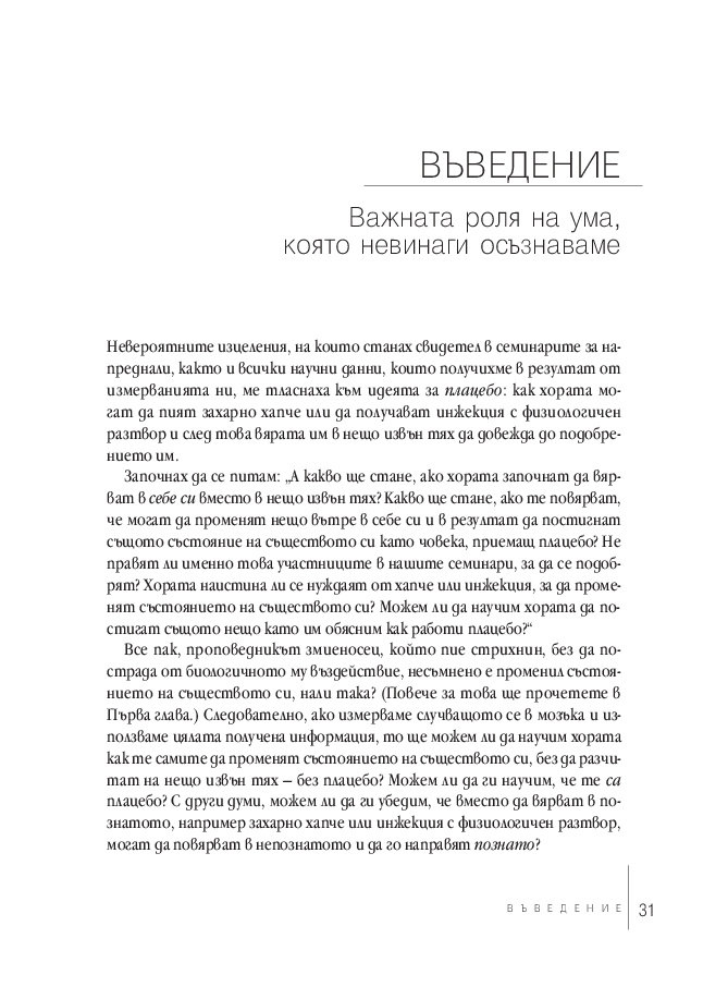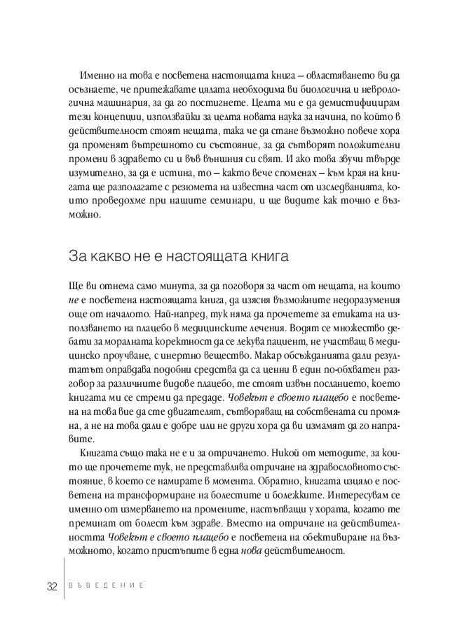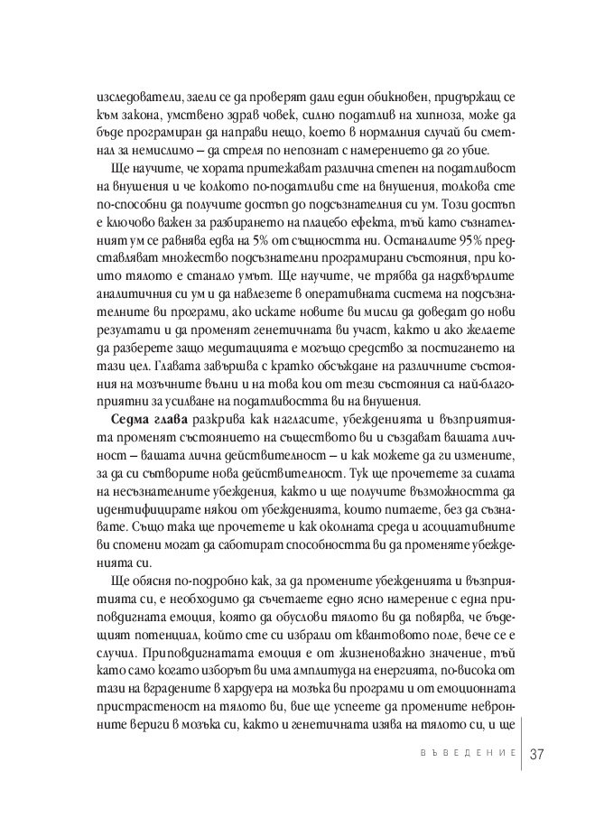 Доктор Джо задава въпроса „Възможно ли е да се преподадат принципите на плацебо и без да се разчита на външна субстанция, да се предизвикат същите ефекти като предизвикваните от тази субстанция вътрешни промени в здравното състояние на индивида и в крайна сметка – в живота му?“ А след това авторът споделя с читателите научни данни (включително цветни изображения от мозъчни сканирания) за впечатляващи излекувания, случили се по време на негови семинари, на които той учи участниците на модела си за лична трансформация, основаващ се върху практическото приложение на т. нар. „плацебо ефект“. Книгата приключва с начин как да медитирате