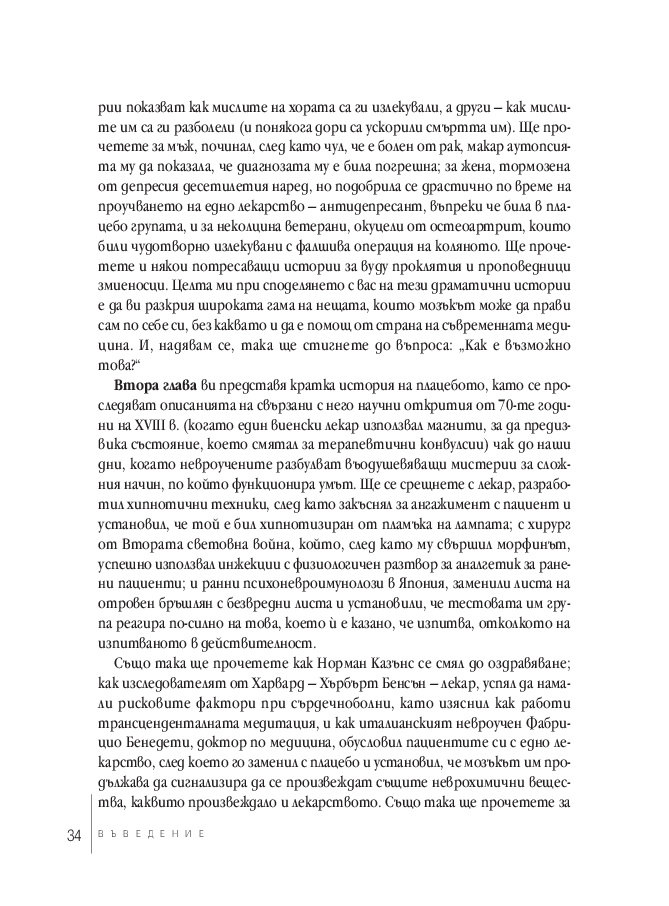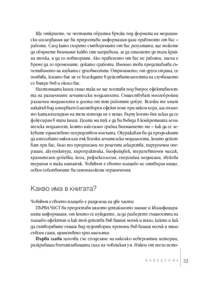 Възможно ли е да се лекуваме единствено чрез мисълта – без лекарства или хирургична намеса? Истината е, че това се случва по-често, отколкото предполагате. В „Човекът е своето плацебо“ д-р Джо Диспенза споделя с читателите си многобройните документирани случаи на хора, преодолели сърдечни болести, депресия, инвалидизиращ артрит и дори тремор, характерен за болестта на Паркинсон, благодарение на вярата си в плацебо ефекта. Освен това той ни разказва и за други хора, които са се разболели и дори са починали, тъй като са станали жертва на вещерско или вуду-проклятие или след като им е поставена неправилна диагноза, че страдат от фатална болест.