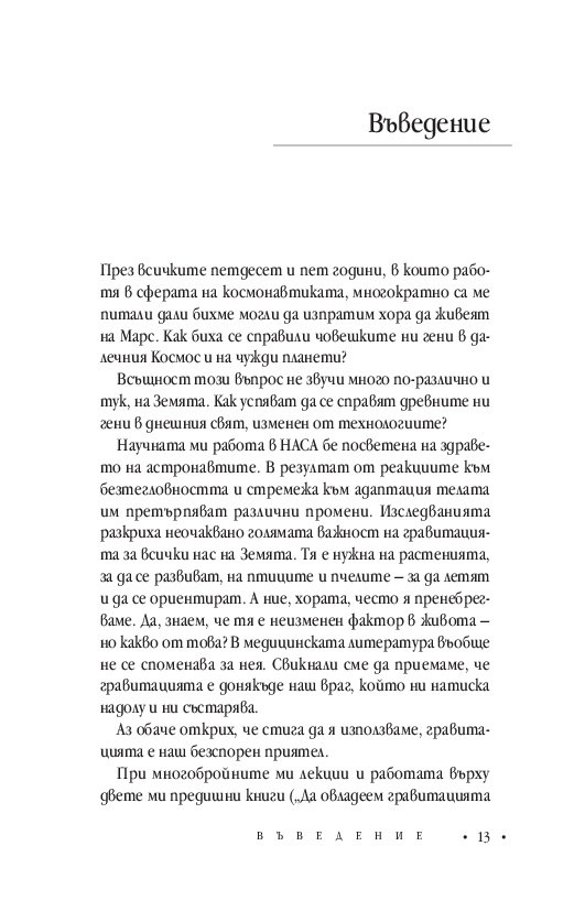 Докато д-р Джоан Верникос наблюдава и отчита въздействието на гравитацията върху човешкото тяло както по време на полет в Космоса, така и на Земята, тя стига до неочаквани и за сама нея изводи. Гравитацията работи в полза на човешкото здраве, е нейното откритие. Дългият престой в безтегловност, както и в неподвижно седнало състояние (пред компютъра или телевизора, например, или поради някакво заболяване), довеждат до еднакви последици за организма, съизмерими с бързото остаряване.