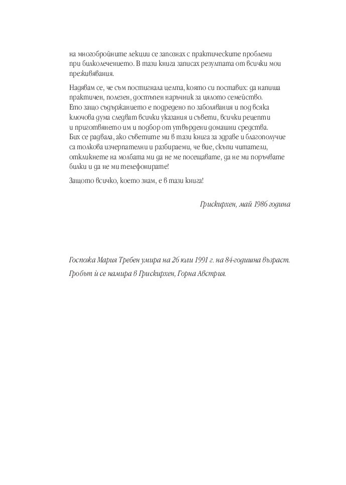 Мария Требен е родена в град Жатец в бившата Судетска област. Баща й е собственик на печатница и издател, а майка й е домакиня. На десет години загубва баща си при пътен инцидент. Две години по-късно тя заминава с майка си и двете си по-малки сестри за Прага. След завършването на девическото училище започва работа на 18 години като стажант в редакцията на „Прагер Тагеблат“. След 14 години трудов стаж (междувременно работи като секретарка на известния писател Макс Брод) Мария Требен се омъжва за инженера от Дружеството за електроцентрали на Горна Австрия Ернст Требен и до края на живота си остава домакиня. Младата двойка се премества в Каплице в Бохемия. Ражда се единственият им син Курт и след края на войната през 1946 г. семейство Требен е изселено. След едногодишно лутане през няколко германски лагера семейството се установява в Австрия и от 1954 г. живее в малкия горноавстрийски град Грискирхен. Раждат им се три внучета, построяват си къща, в семейството цари щастие и хармония. Още от малка Мария Требен добре познава природата и растенията в нея, но едва срещата й с биолога Рихард Вилфорт й отваря очите за действието на познатите й треви. Мария Требен се занимава усилено с лечебните свойства на билките, трупа познания и опит от по-възрастни хора от селата. През 1971 г. тя изнася първата си лекция в тесен кръг. Броят на слушателите нараства постоянно. До 1977 г. тя кръстосва Австрия надлъж и шир, изнася лекции пред все по-многобройна публика. През 1977 г. идва и първата покана от Германия. Обикновената домакиня запленява все повече хора. Залите се оказват малки да поберат желаещите да присъстват на лекциите й. Две-три хиляди души посещават вече нейните изяви, когато издателят Вилхелм Енстхалер я увещава да напише книга по своите записки от лекциите. Резултатът е известен – световният бестселър „Здраве от аптеката на Господ“. Почти десет години след появата му Мария Требен завършва втората си книга, която държите в ръцете си. Едно богато, ценно и систематизирано произведение, за което тя скромно казва: „Всичко, което знам, е в тази книга“!