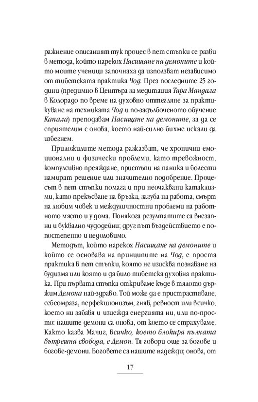 Да наситим своите демони е вдъхновена от древната тибетска практика Чод, разработена от Мачиг Лабдрон – първата жена учител по будизъм от XI век. Дългогодишен практикуващ и учител в областта на духовното знание, лама Цултрим Алионе (автор на Жените на мъдростта) заимства и доразвива идеята за работа с демоните, принасяйки я в дар на съвременния човек. Тя хвърля мост към днешната западна психика и предлага достъпен и ефективен подход за справяне с отрицателните емоции, страховете, болестите и самоунищожителните модели, като извежда радикалната представа, че за да се изцелим, трябва да храним, а не да се борим с демоните си.