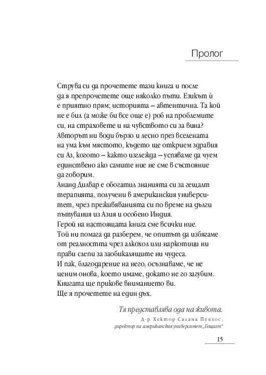 Написана с вълнуваща простота, тази книга със сигурност ще ви плени и вдъхнови. А онези, които искат да разберат защо толкова много хора са нещастни или смятат, че не са постигнали целите си, или пък усещат дълбока празнота в живота си и не могат да намерят любов без конфликти, ще открият отговори на всички тези въпроси.